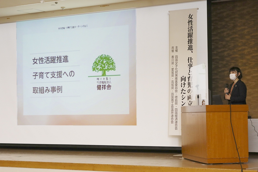 1月21日、徳島市のあわぎんホールで、四国少子化対策推進委員会・徳島県・四国経済連合会の主催により、「女性活躍推進、仕事と育児の両立支援に向けたシンポジウム」が開催されました。