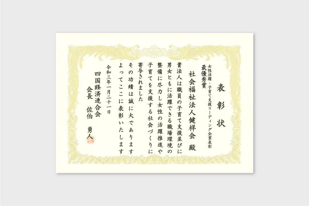 「女性活躍・子育て支援リーディング企業表彰」は委員会の活動のひとつで、「子育て支援」や「女性の活躍推進」に対して先進性のある取り組みを積極的に行なっている企業を顕彰するものです。各県から推薦された4社の中で、社会福祉法人健祥会が2020年度女性活躍・子育て支援リーディング企業として最優秀賞を受賞。理事長中村太一と人事部副部長北池桂子が表彰式とシンポジウムに出席しました。