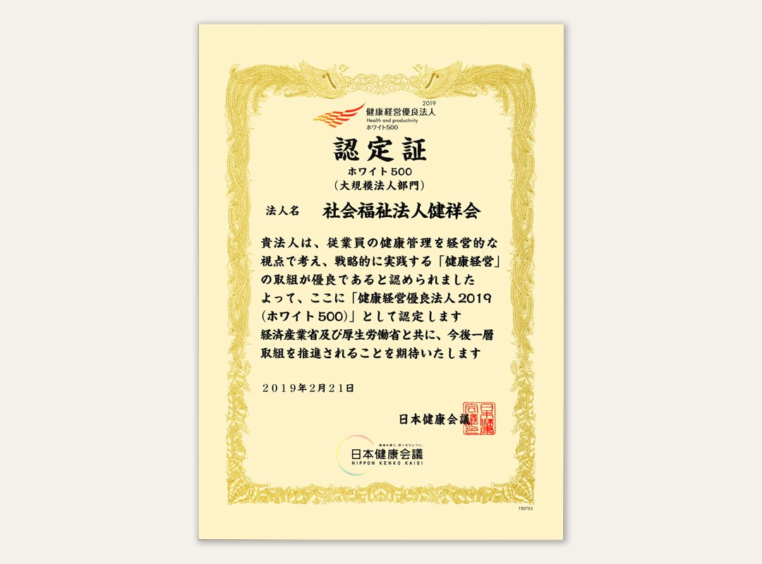 経済産業省が、健康経営の普及促進に向け、優良な健康経営を実践している法人を顕彰する「健康経営優良法人認定制度」において、健祥会グループ(社会福祉法人健祥会・社会福祉法人緑風会・社会福祉法人育英福祉会・社会福祉法人青嵐会)が「健康経営優良法人2019」に選ばれました。