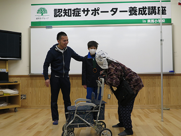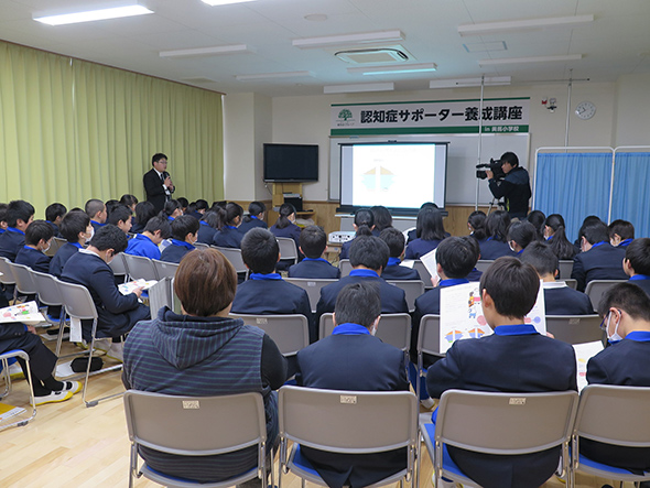 1万人の目標達成まであと8人に迫った2月14日、美馬市の美馬小学校で、5年生の児童と先生に向けた講座を開催。特別養護老人ホーム健祥会家康施設長による講座に加え、職員の寸劇で良い対応例悪い例などを紹介しながら、子どもたちにわかりやすく楽しく学んでもらいました。