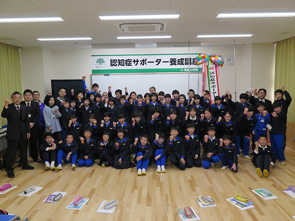 健祥会グループでは、認知症への理解促進を図るために、2014年より「認知症サポーター」養成講座を施設内外で実施。健祥会主催の徳島県内の講座で「2017年度中に1万人」の目標を掲げ、サポーター養成に努めています。