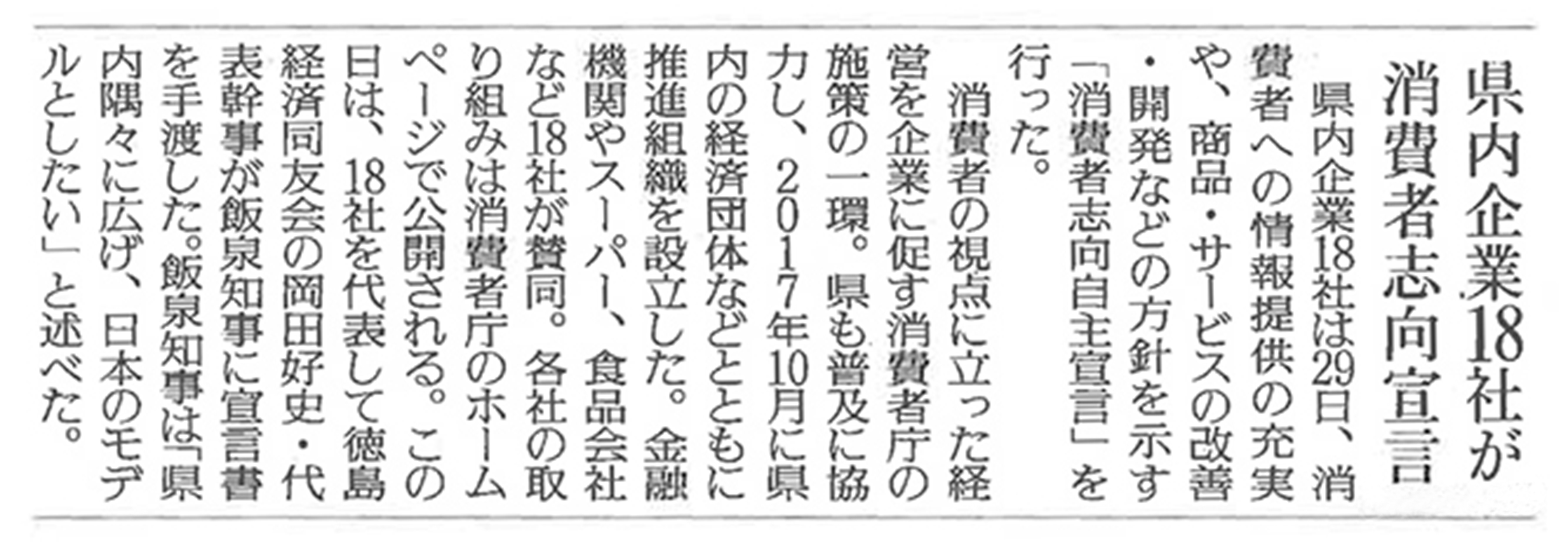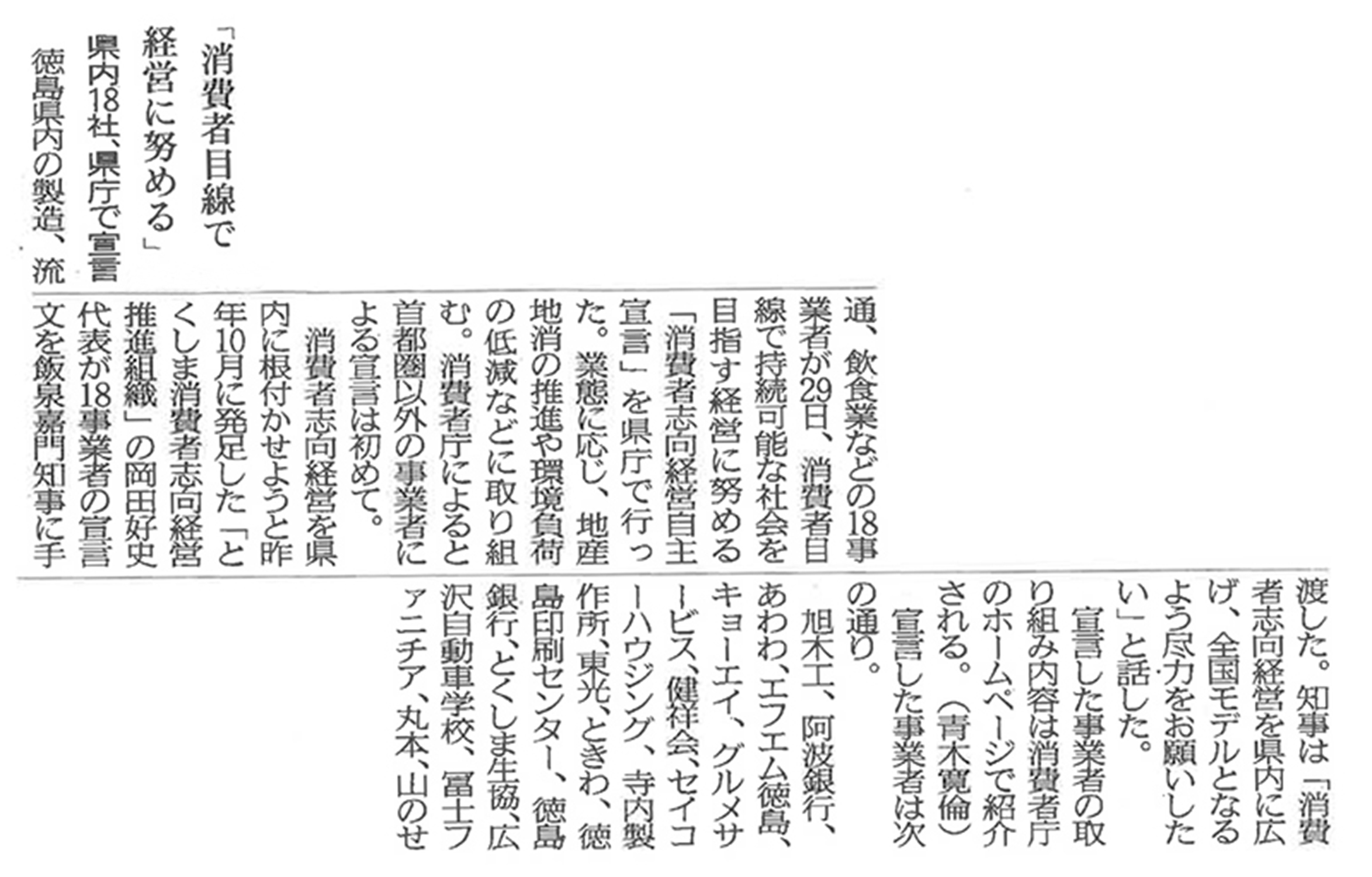 この記事は公開から1年以上経過しています メディア掲載記事 2017年1月30日(月) 消費者目線で経営に努める 県内18社、県庁で宣言 | 徳島新聞・読売新聞 ■徳島新聞(2018/01/30掲載) ■読売新聞(2018/01/30掲載) [記事公開日]2018/02/06(火) 消費者目線で経営に努める 県内18社、県庁で宣言 | 徳島新聞・読売新聞 新しい記事 ドライブレコーダー県内事業所導入進む│徳島新聞 古い記事 つながり合い、支え合う安心の地域づくりめざして 認知症サポーター養成「優秀キャラバン・メイト」表彰 過去の記事へ