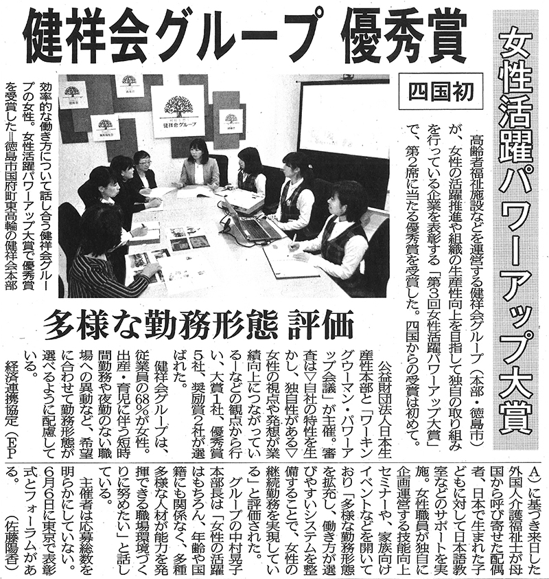 この記事は公開から1年以上経過しています メディア掲載記事 2018年5月11日(金) 女性活躍パワーアップ大賞 四国初健祥会グループ 優秀賞 | 徳島新聞 ■徳島新聞(2018/05/11掲載) 関連記事 「女性の活躍で、組織にパワーを」 健祥会グループが「女性活躍パワーアップ大賞」優秀賞受賞! [記事公開日]2018/05/11(金) 働きやすい職場づくり 女性活躍パワーアップ大賞 四国初 健祥会グループ 優秀賞 | 徳島新聞 新しい記事 清々しい笑顔いっぱい 第14回健祥会杯グラウンド・ゴルフ大会 古い記事 子育てに優しい職場として 「とくしま子育てサポート賞」を受賞 過去の記事へ