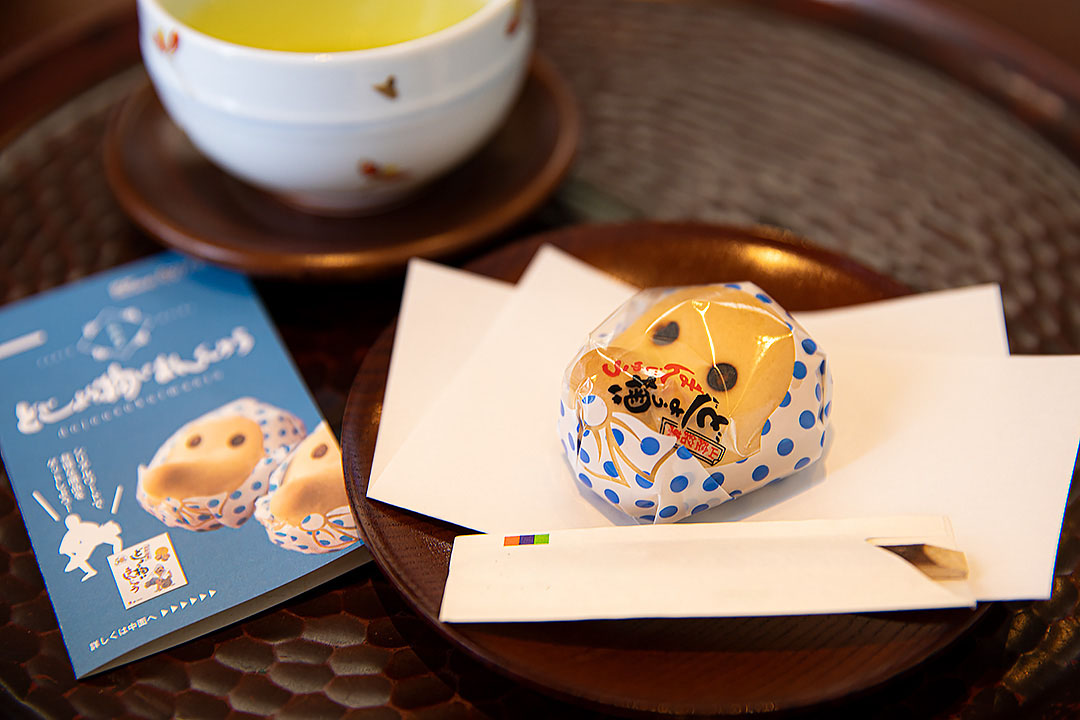 今年の銘菓は、1967年の誕生以来50年余、山陰銘菓として愛され続ける「どじょう掬いまんじゅう」。山陰民謡「安来節」に合わせ、こっけいな仕草で踊るおなじみの「どじょう掬い」そのままに、ひょっとこのお面と青い水玉模様の手ぬぐいが笑みを誘います。