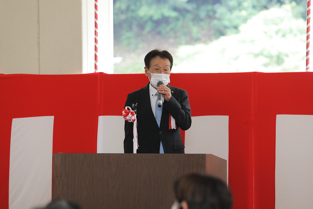 坂口町長をはじめ、地権者様、日頃より温かいご協力ご支援をいただいております皆様方にお越しいただき、10年という節目の式典が開催できますことに、感謝と御礼を申し上げます。また、オープニングセレモニーとしてすばらしい演奏とダンスを披露くださった鷲敷小学校の金管バンド隊の皆さん、本当にありがとうございました。