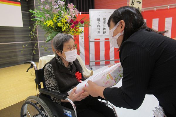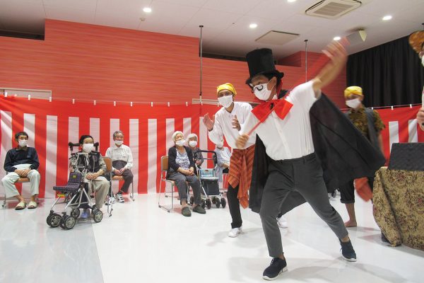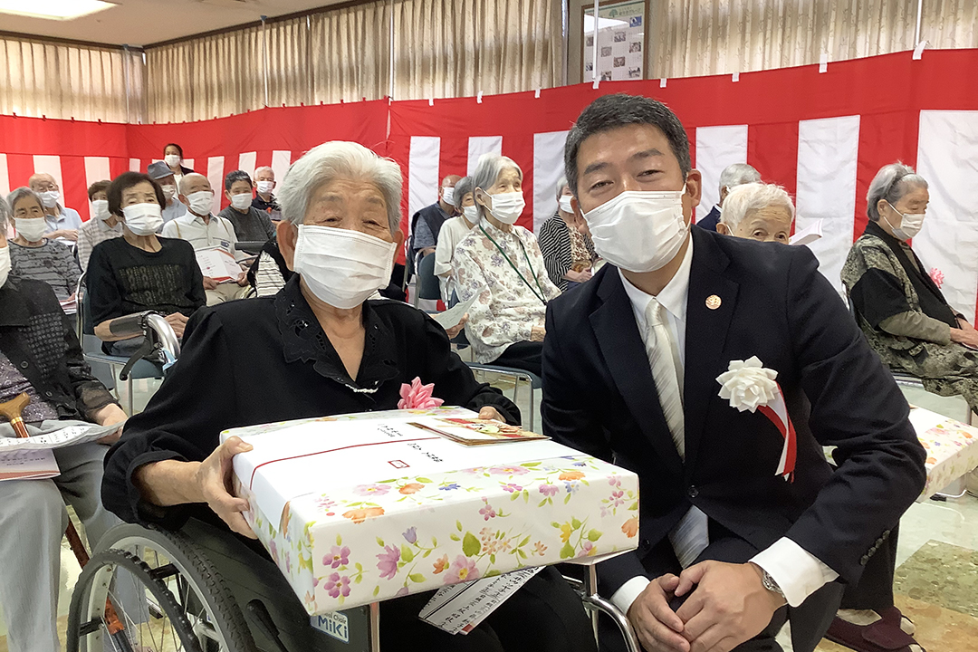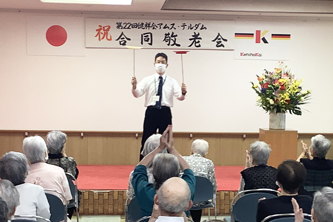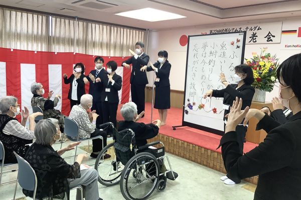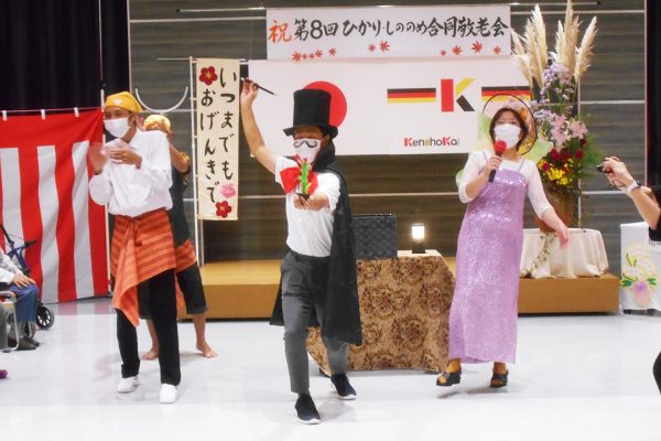 さて、健祥会グループでは、12日に合同敬老会がスタートし、26日までの15日間に、徳島、香川、高知、大阪、京都、東京、全49か所で開催されます。本来ならグループ利用者様だけでなく、地域の皆様も揃ってご長寿をお祝いするのが創設以来の健祥会流なのですが、新型コロナウイルス感染症対策として今年も地域の高齢者様やご来賓のご招待を見送り、ご家族様にもお控えいただき、各施設・各フロアにおいて安全第一で実施しています。華やかな催しのない分、職員が精一杯の心を込めて、楽しい企画や心づくしのお祝い膳をご用意しています。