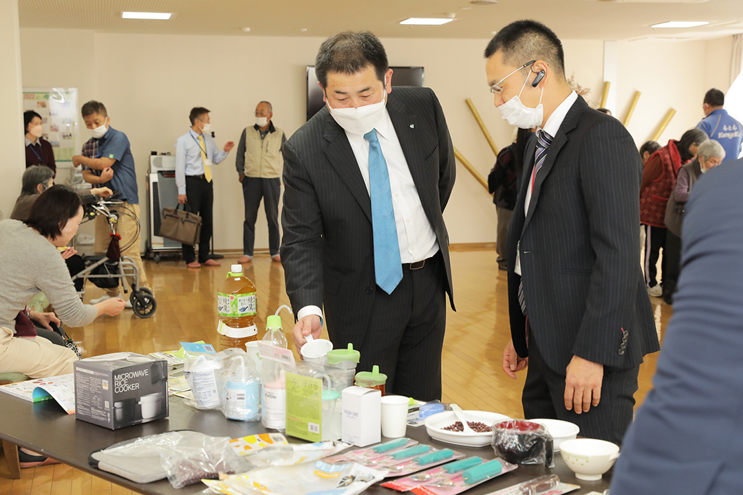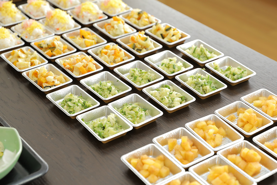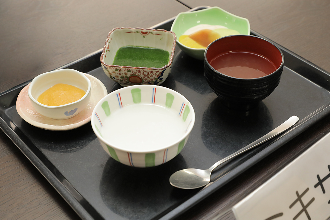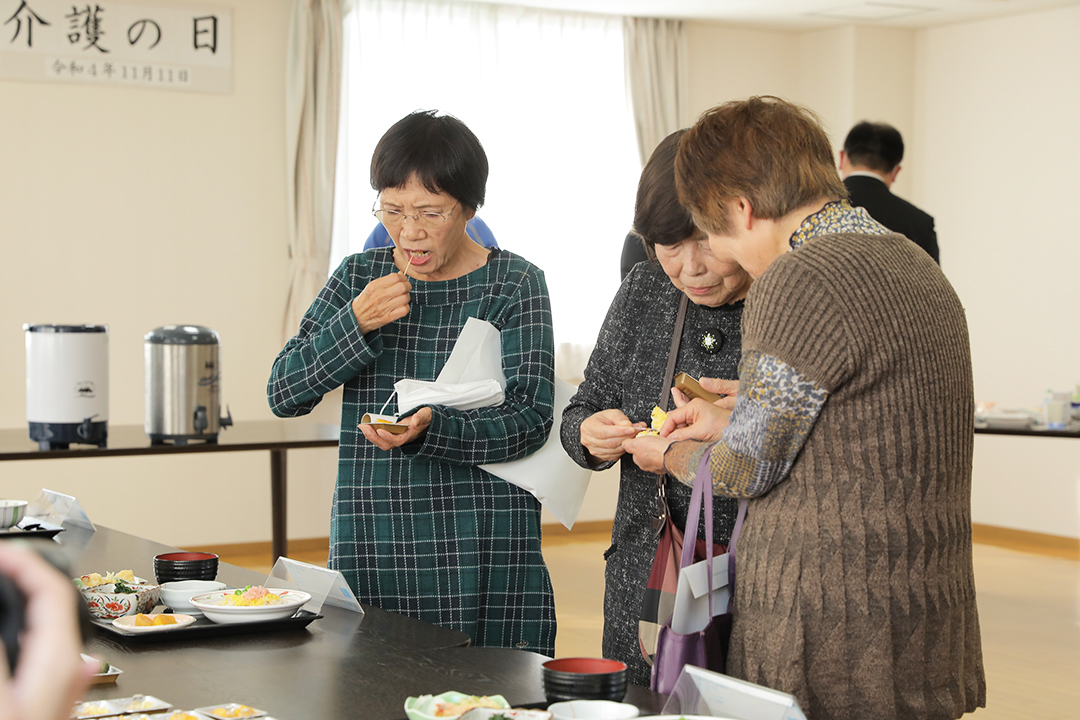 自立してお元気な入居者様は揃って賑やかに楽しそうに試食くださいました。自助具の展示紹介にも興味津々。特別ゲストとして、原井敬吉野川市長がお越しくださり、入居者様や職員とともに、体調や口腔機能にあった様々な食事の、味や見た目の違いを体感してくださいました。