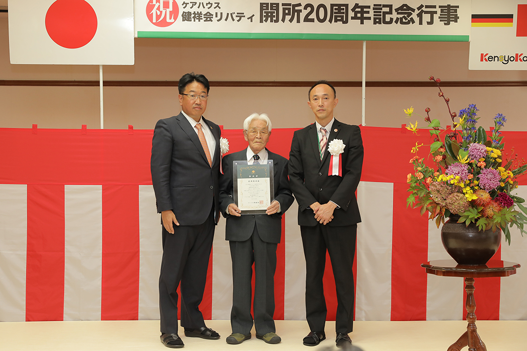 ご来賓のご紹介に続いて、記念冊子の懐かしい写真で20年の歩みを振り返りました。続いて、開所と共に入居以来20年にわたってリバティで暮らしてくださっている方、100歳を超えてなおお元気でお暮らしの方、お二人に感謝状とお祝い状を贈呈し、「健康と自立」を寿ぎました。