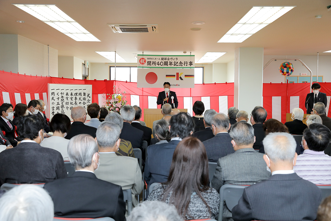 40周年にあたり、これまでお支えいただいた皆様に感謝申し上げ、これから先もこの川島の地に「健祥会」があって良かったと言っていただけるように、利用者様本意のサービスと地域福祉の向上に力を尽くしてまいります。さらに10先、20年先を目標に頑張ってまいりますので、変わらぬご指導・ご支援を切にお願い申し上げ、開所40周年記念式典のご挨拶といたします。本日はありがとうございました。