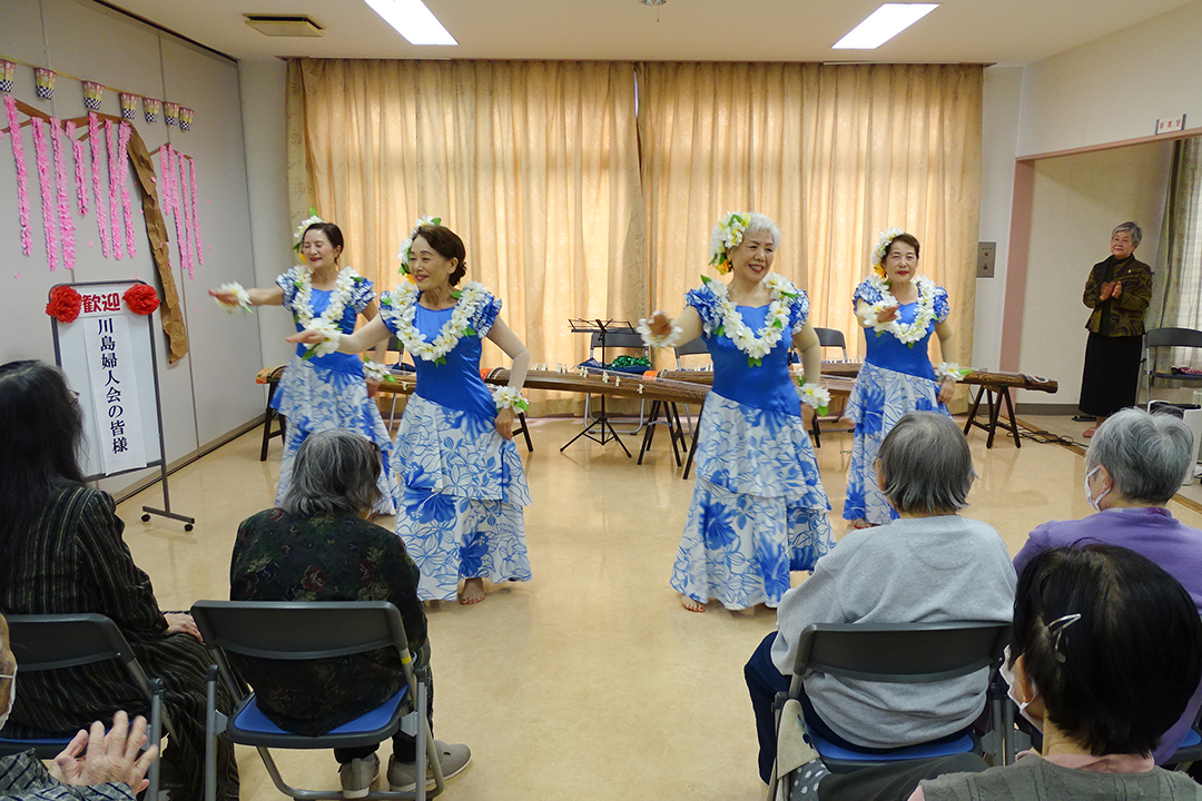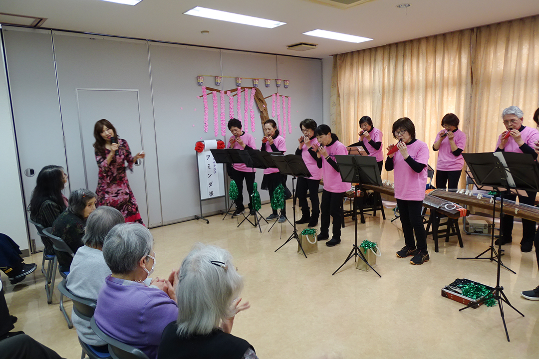 お昼の会食をはさんで、川島町婦人会の皆様によるフラダンスショーと地域のオカリナクラブ「アミンダ」の皆様の演奏を入居者様たちに楽しんでいただきました。川島町婦人会様、「アミンダ」様、お祝いムードを盛り上げるすてきなひとときをありがとうございました。