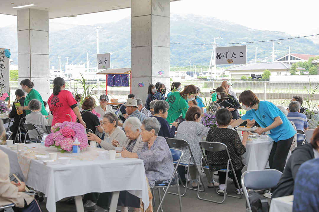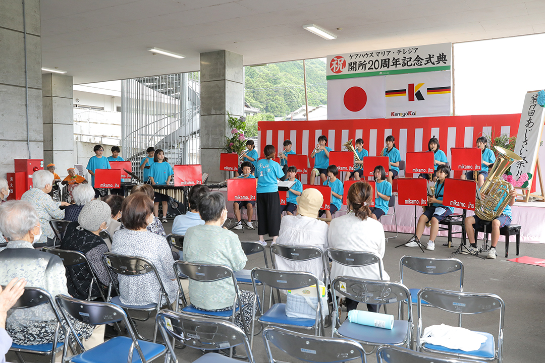 式典に引き続き、隣接する特別養護老人ホーム健祥会たんぽぽと合同で、恒例のあじさい祭りを開催。300人もの地域の方々がご参加くださいました。お祭りでは、ちらし寿司や赤飯、そうめん、唐揚げやたこやきなど、屋台の味を楽しんだり、午後には三加茂中学校吹奏楽部の演奏、地域のスタジオFUNのダンスも披露されました。三加茂中学校吹奏楽部の皆さんの演奏で、利用者様が「ふるさと」を歌う一幕もあり、和やかなあたたかなひとときとなりました。