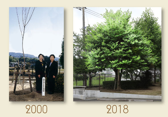 利用者様が施設に贈ってくださったむくの木も前庭でずいぶん大きくなり、時の流れを感じさせてくれます。そしてその利用者様は今もお元気で施設ですごしてくださっており、このたび、感謝状が贈呈され、笑顔で受け取ってくださいました。