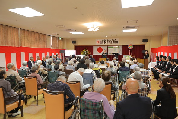 激動の時代を乗り越え、無事20周年を迎えられたことに感謝し、7月2日には、利用者様やご家族とともにお祝いの式典を開催しました。岩浅嘉仁阿南市長をはじめ、いつもご協力いただいている地域の皆様、工事関係者様、歴代の施設長にもご列席いただきました。