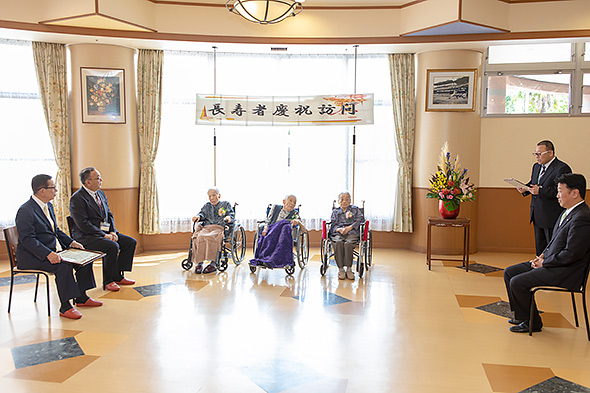 敬老会に先立って、徳島県知事代理として東部保健福祉局大西英治様、吉野川市長川真田哲也様が慶祝訪問にお越しくださり、特別養護老人ホーム水明荘の103歳のおふたりと101歳のおひとりにお祝い状と記念品をお贈りくださいました。
