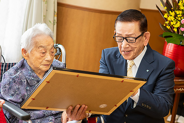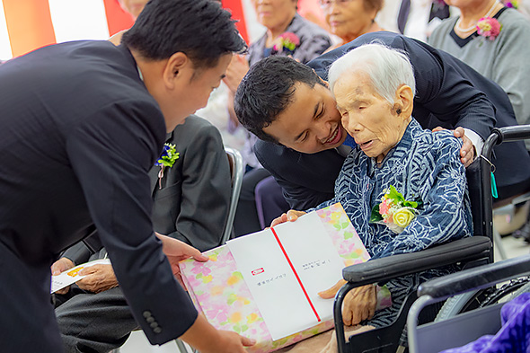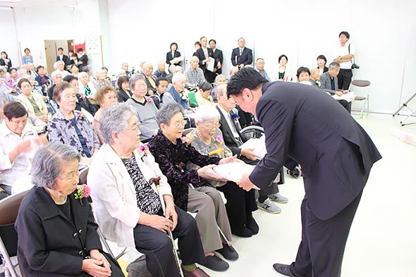 今、記念品をお渡ししながら、皆様がお若く、すてきな笑顔でいらっしゃることを本当に素晴らしいと思いました。ますますお元気で長生きしていただけるよう、私たちが精一杯お手伝いをさせていただきます。