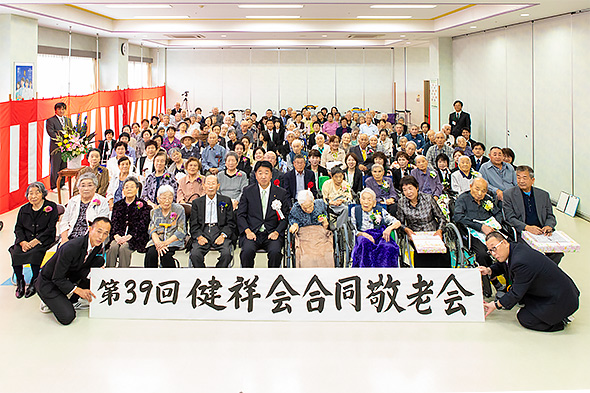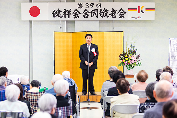 皆様、ご長寿おめでとうございます。猛暑と、多発する自然災害に見舞われた夏でしたが、つつがなく初秋を迎えられ、ようこそ第39回健祥会合同敬老会にお越しくださいました。心からお祝い申し上げますとともに、日頃よりのご利用、ご支援ご協力に感謝申し上げます。