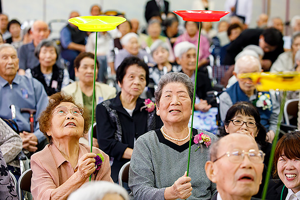 9月17日の敬老の日の前後2週間にわたって、健祥会グループでは、全国38ヶ所で合同敬老会が開催されます。「合同」と冠されるのは、施設の入所様も、在宅サービスの利用者様も、地域の皆様も、揃ってご長寿をお祝いするから。39年前、特別養護老人ホーム水明荘の開所とともにはじまりました。合同敬老会ごとに恒例の長者番付ならぬ長寿番付がつくられ、皆様の励みとしていただいています。