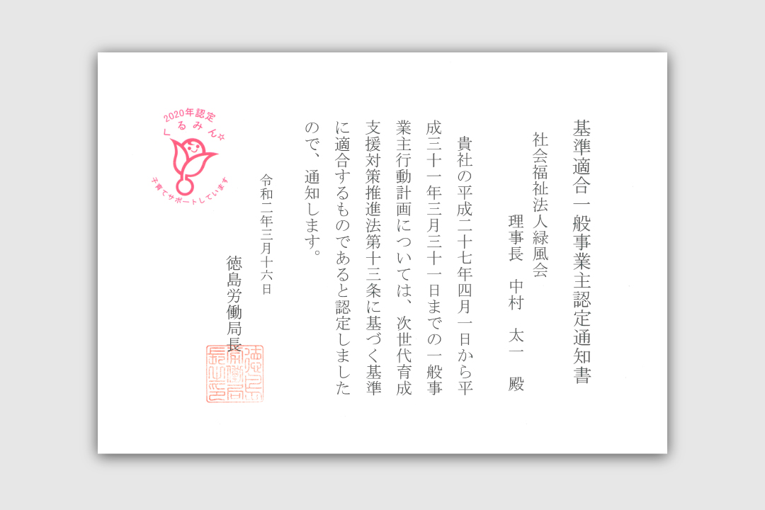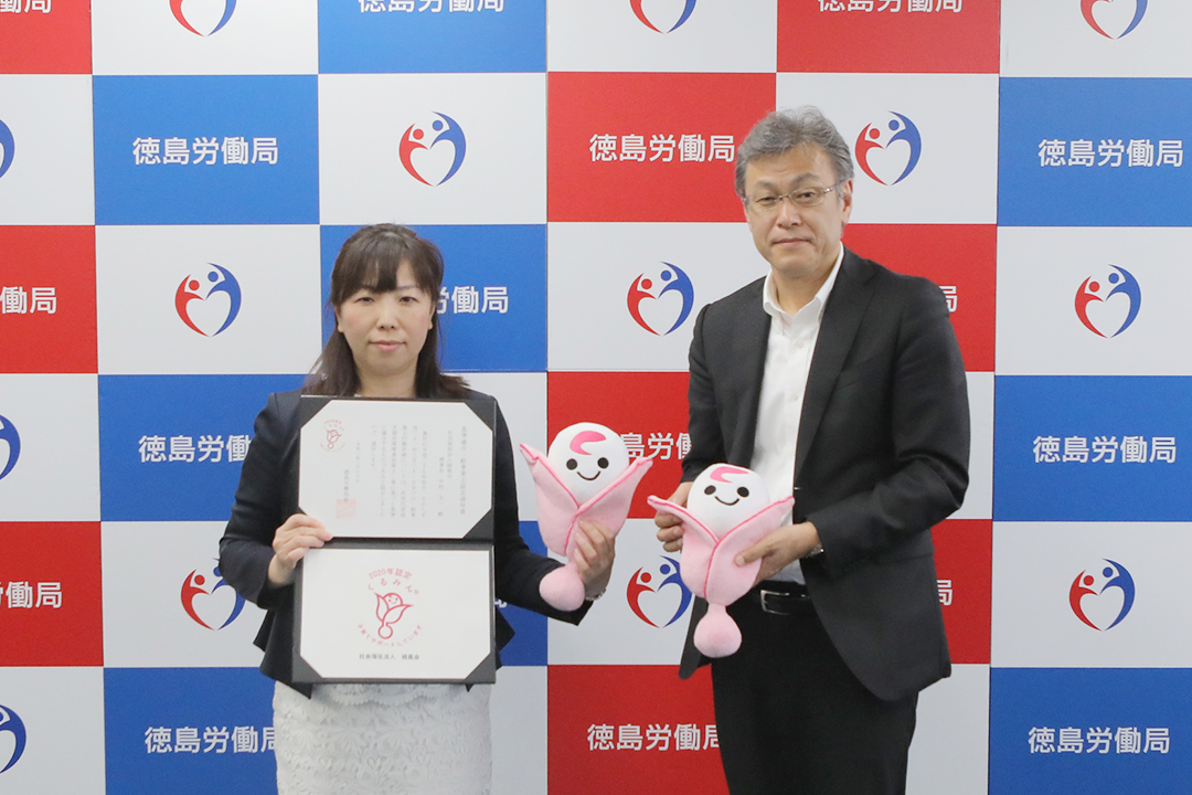 2020年度、健祥会に続いて緑風会も、「子育てサポート企業」として厚生労働大臣の認定「くるみん認定」を取得。コロナ対策で延期となっていた認定証授与式が、徳島労働局で行われ、健祥会グループ本部長中村晃子が日根直樹局長から認定証をいただきました。