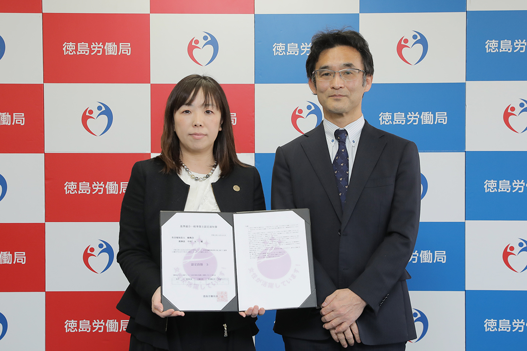 2017年に社会福祉法人健祥会が、1.採用 2.継続就業 3.労働時間等の働き方 4.管理職比率 5.多様なキャリアコースという5つの評価項目の基準をすべてクリアし、最高位の三つ星に選ばれ、徳島県ではじめての認定を受けました。