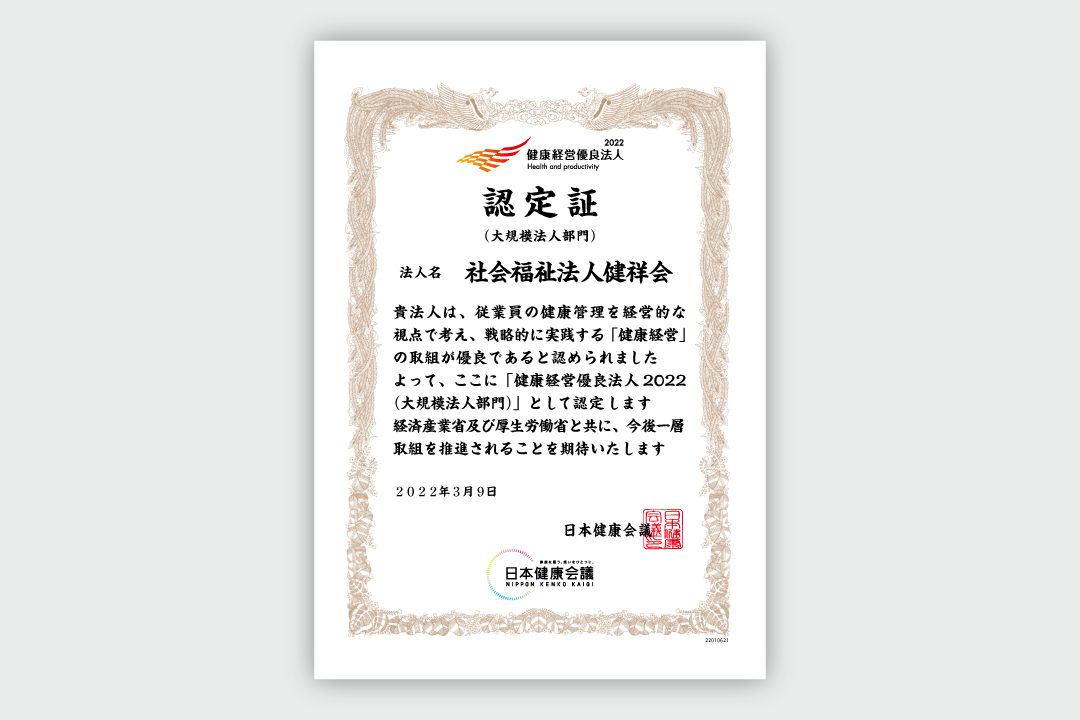 従業員の健康管理を経営的な視点で考え、戦略的に取り組んでいる優良な法人を顕彰する経済産業省の「健康経営優良法人認定制度」により「健康経営優良法人2022」が発表になり、健祥会グループ4法人(社会福祉法人健祥会・社会福祉法人緑風会・社会福祉法人育英福祉会・社会福祉法人青嵐会)が、揃って3度目の認定を受けました。独自の組合健保を持つ大企業が居並ぶ大規模法人部門で、2,299法人の中に名を連ねての栄誉です。