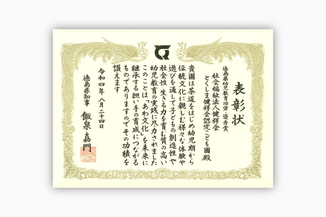徳島県が創設した徳島県幼児教育功労表彰制度において、とくしま健祥会認定こども園が第1回の優秀賞を受賞しました。