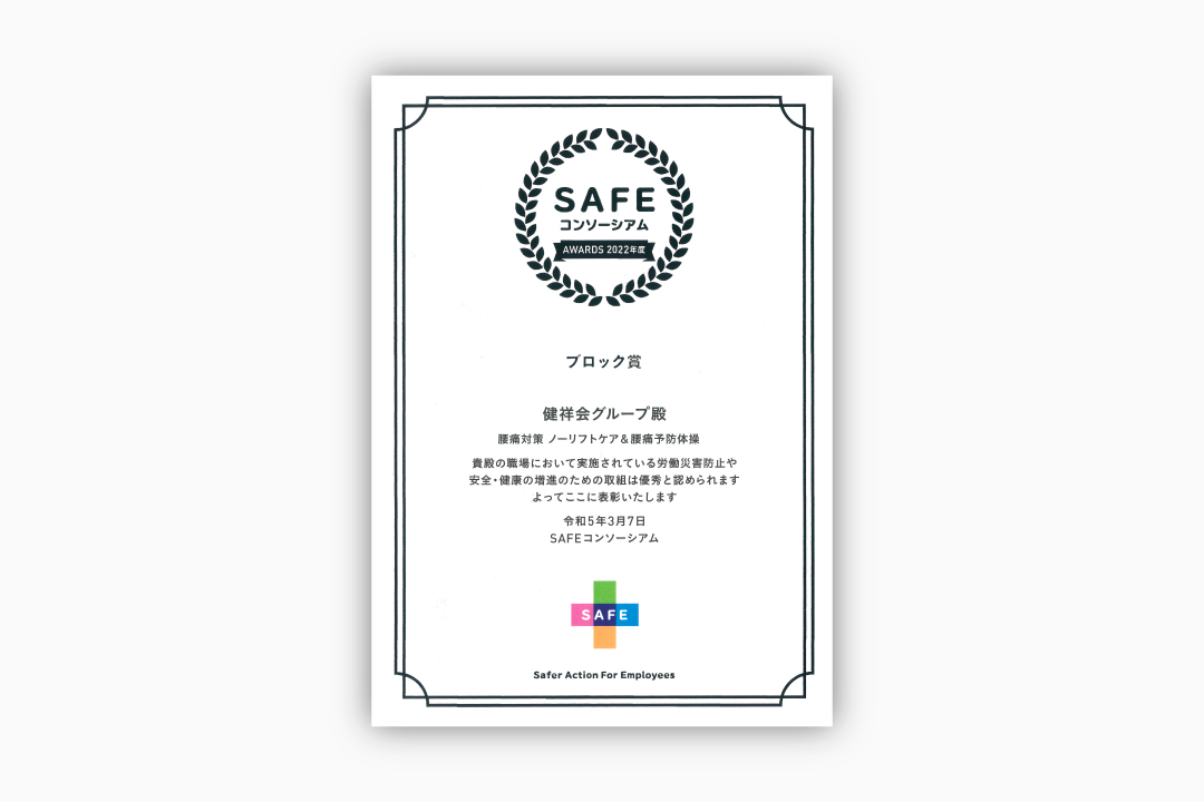 SAFEコンソーシアムは活動の一環として、加盟者間の取り組みの共有と顕彰を目的にアワードを設けており、2022年度のアワードにおいて、85件の応募の中から健祥会グループが腰痛予防部門ブロック賞を受賞しました。