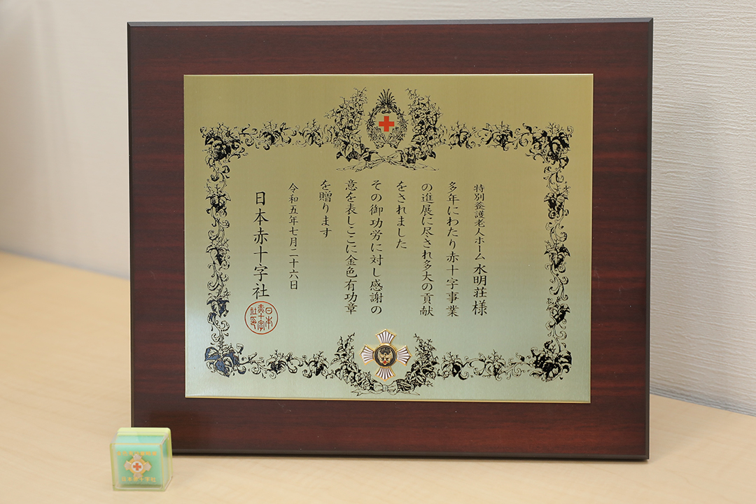 日本赤十字社の金色有功章については、2021年に、専門学校健祥会学園も受賞しています。水明荘では2017年の銀色有功章、昨年の厚生労働大臣から贈られる献血功労表彰に続く嬉しい受賞です。ありがとうございました。今後も、地域への感謝を忘れず、地域のためにできることをこつこつと実践してまいります。