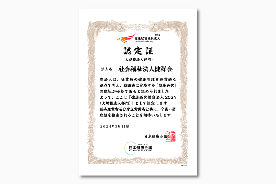 経済産業省の「健康経営優良法人認定制度」による「健康経営優良法人2024」が発表になり、健祥会グループ4法人(社会福祉法人健祥会・社会福祉法人緑風会・社会福祉法人育英福祉会・社会福祉法人青嵐会)が、今年も揃って認定を受けました。この制度は、従業員の健康管理を経営的な視点で考え、戦略的に取り組んでいる優良な法人を「見える化」することで、従業員や求職者、関係企業や金融機関などから社会的評価を受けることができるように、さらにそのことで健康経営への取り組みがより普及促進されるようにという目的で設けられたものです。