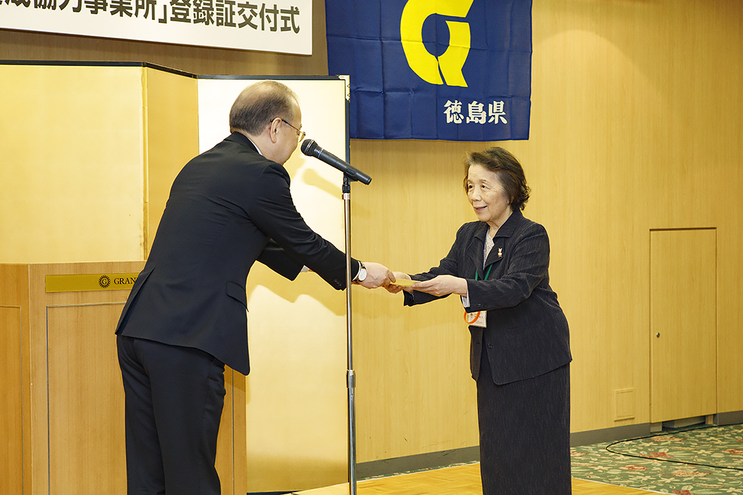 徳島県は講師として多くのサポーターを養成した「優秀キャラバン・メイト」の表彰と一定人数のサポーターを擁する事業所の登録を毎年実施しており、このほど県庁にて、平成30年度「優秀キャラバン・メイト」表彰式及び「認知症サポーター養成協力事業所」登録証交付式が行われました。