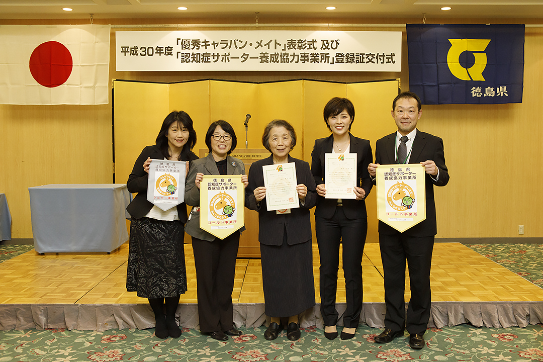 徳島県は講師として多くのサポーターを養成した「優秀キャラバン・メイト」の表彰と一定人数のサポーターを擁する事業所の登録を毎年実施しており、このほど県庁にて、平成30年度「優秀キャラバン・メイト」表彰式及び「認知症サポーター養成協力事業所」登録証交付式が行われました。