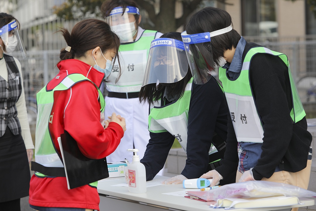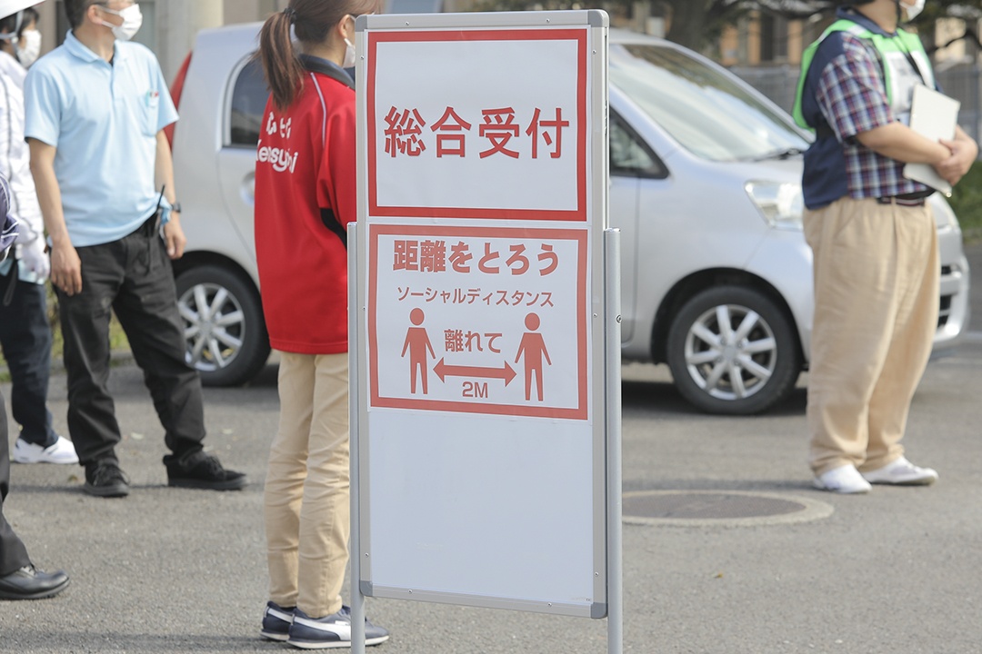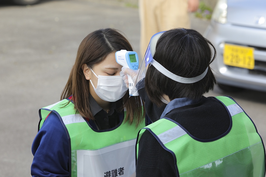 避難者については、コロナ対策として、健康な人と、発熱や体調不良のある人の受け入れ場所を分け、さらに総合受付で健康チェックを行ったのち、誘導。受付担当者はマスク、手袋、フェイスシールドを着用し、混乱し混雑しやすい避難所では距離の取り方の徹底を図ります。