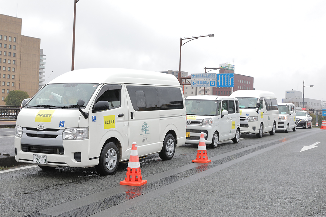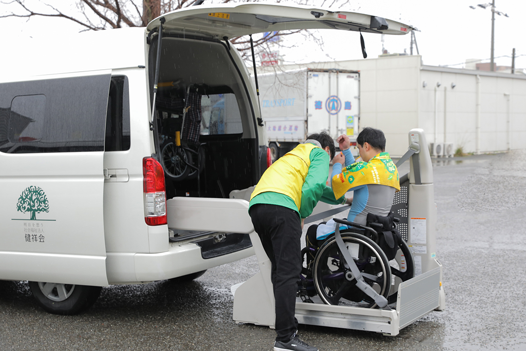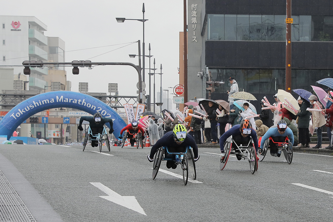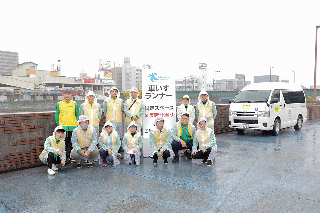 あいにくの雨空となった3月24日。午前8時50分に「車いすロードレース」がトップを切って徳島県庁前国道(国道55号かちどき橋南詰)をスタート。5人の車いすランナーが、吉野川大橋北詰までの3.5kmのコースに挑戦しました。健祥会グループのボランティアスタッフはとくしまマラソン実行委員会と協力・連携し、スタート会場でランナーをサポートするとともに、4台のサポート車を出して車いすやランナーの移送を担当。安全第一で、事故なく競技を終えることができました。