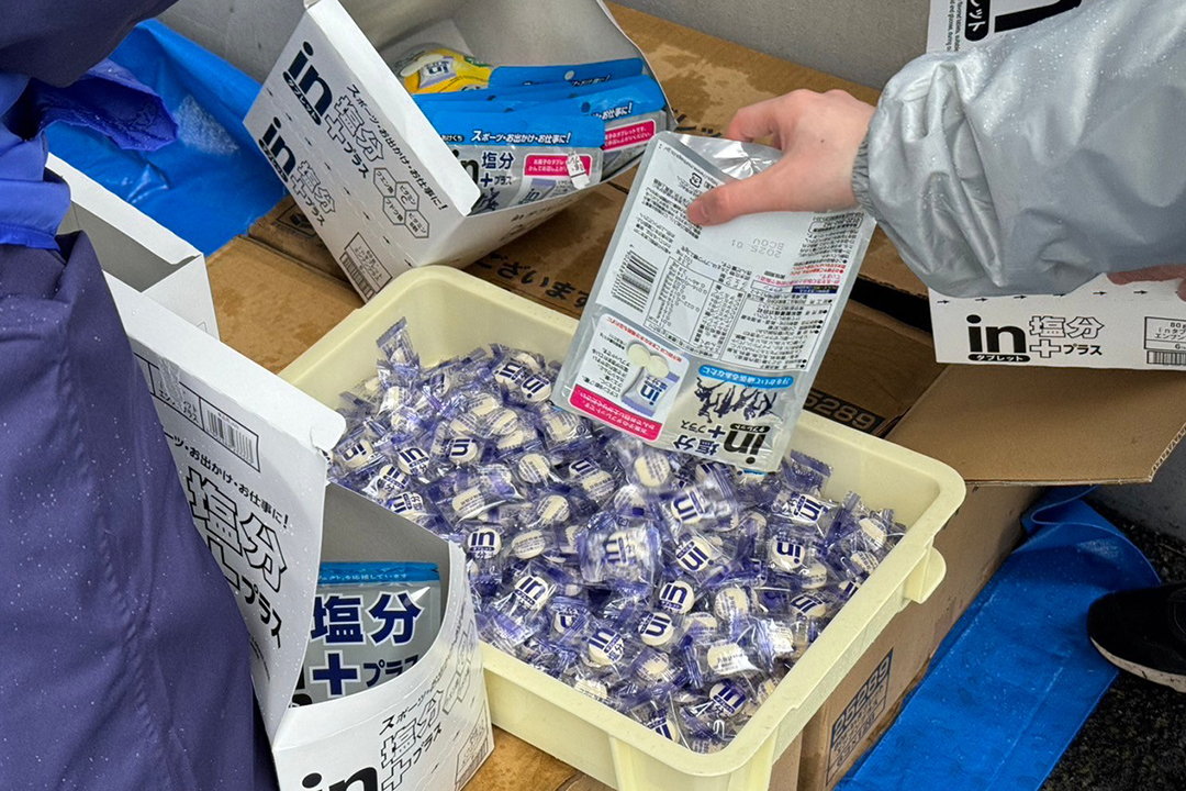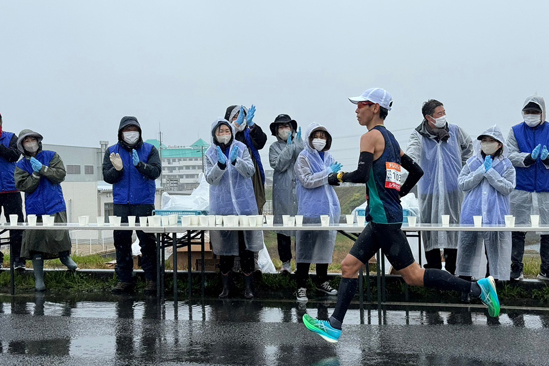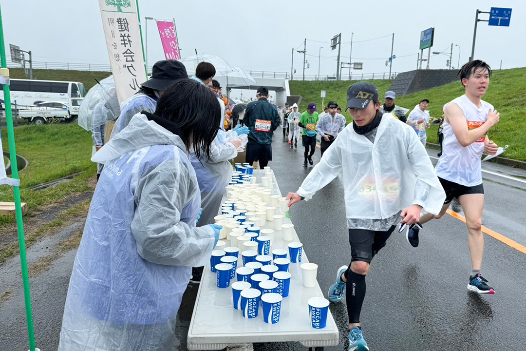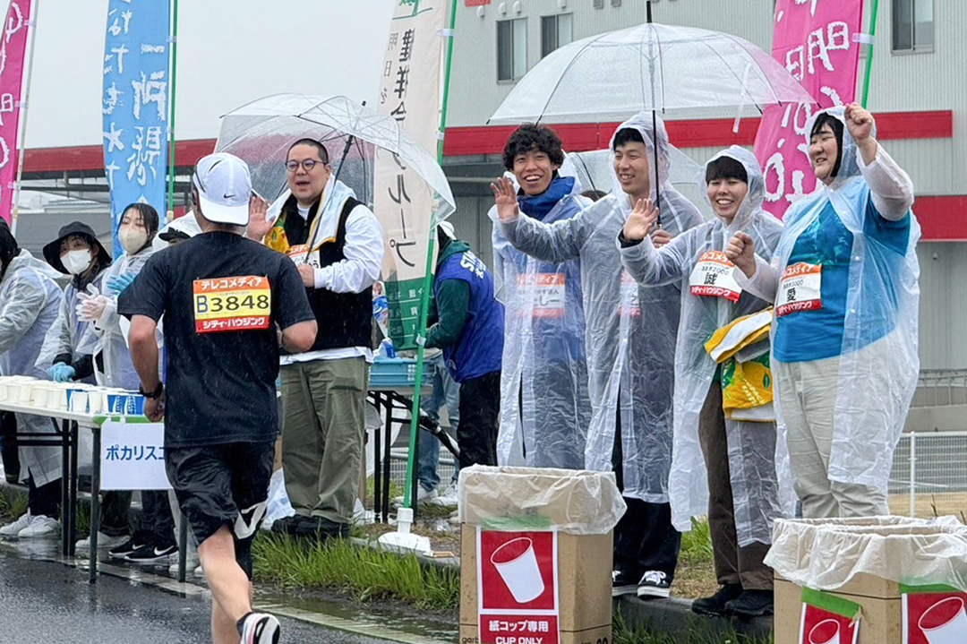 フルマラソンは午前9時に第1グループ、10分後に第2グループがスタート。第4給水所は、42.195kmのコースの前半、17km付近。第9回大会より掲げるカラフルなのぼりのもと、68名の職員が塩と水、スポーツドリンク、バナナのサービスを担当し、雨の中、ゴールとなるワークスタッフ陸上競技場(徳島市陸上競技場)めざして次々と走りくるランナーにエールを送りました。