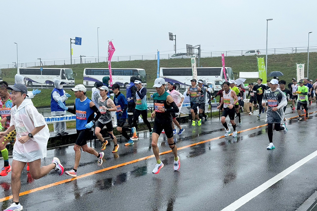 降りしきる雨をモノともせず、カッパを着たり傘をさしたりしながら応援する沿道の人々に、ランナーの皆さんはとても励まされたことと思います。7時間の競技時間内の完走者は5975人、完走率は91.9%でした。コンディションが悪い中、懸命にゴールをめざした皆さん、たいへんお疲れ様でした。