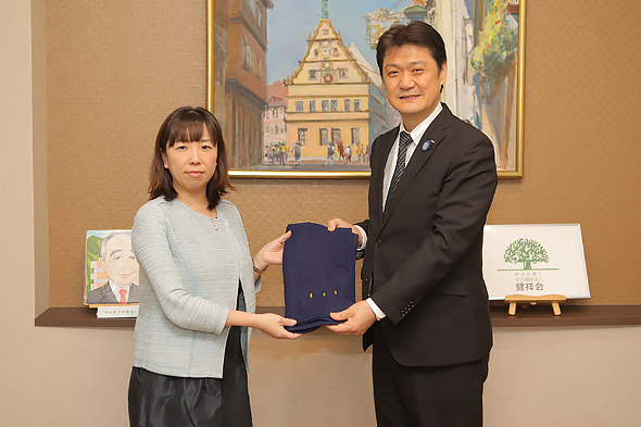 佐野支店長から健祥会グループ本部長の中村晃子へ、文字通りあたたかな贈り物が手渡され、中村晃子は「ご厚意に心から感謝いたします。グループ内の各施設で緊急時・災害時などにとても役立ってくれると思います」と謝意をお伝えしました。
