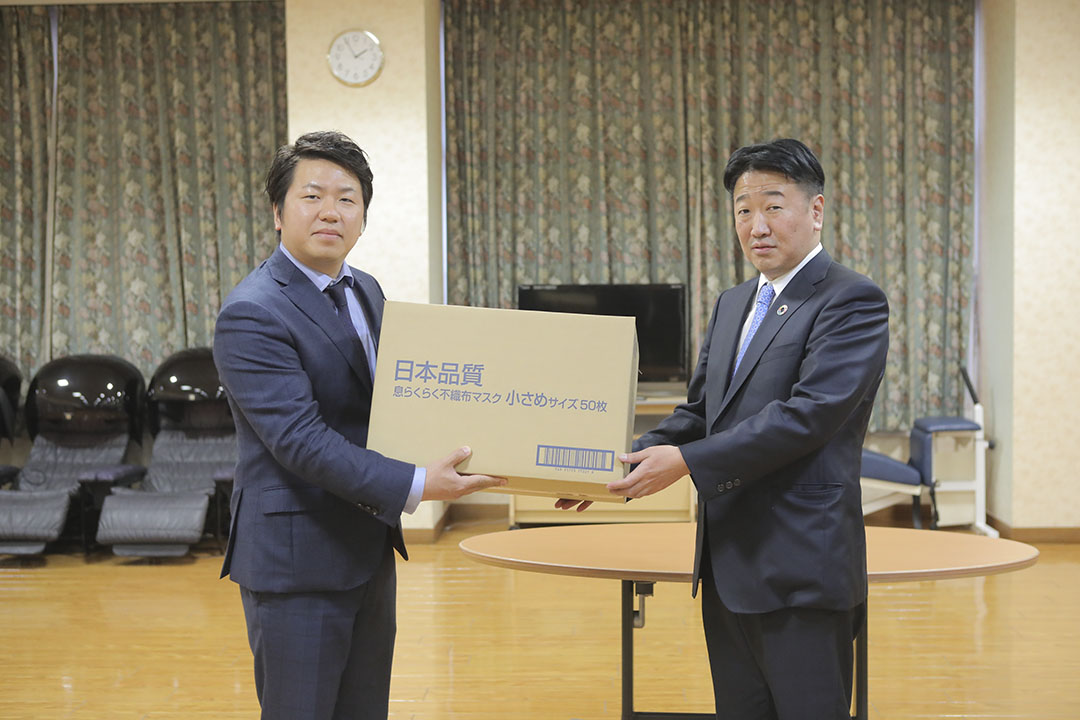 年度始めの日、グループ本部まで4000枚のマスクをお届けくださった瀧上社長に、理事長中村太一より感謝状を贈呈しました。