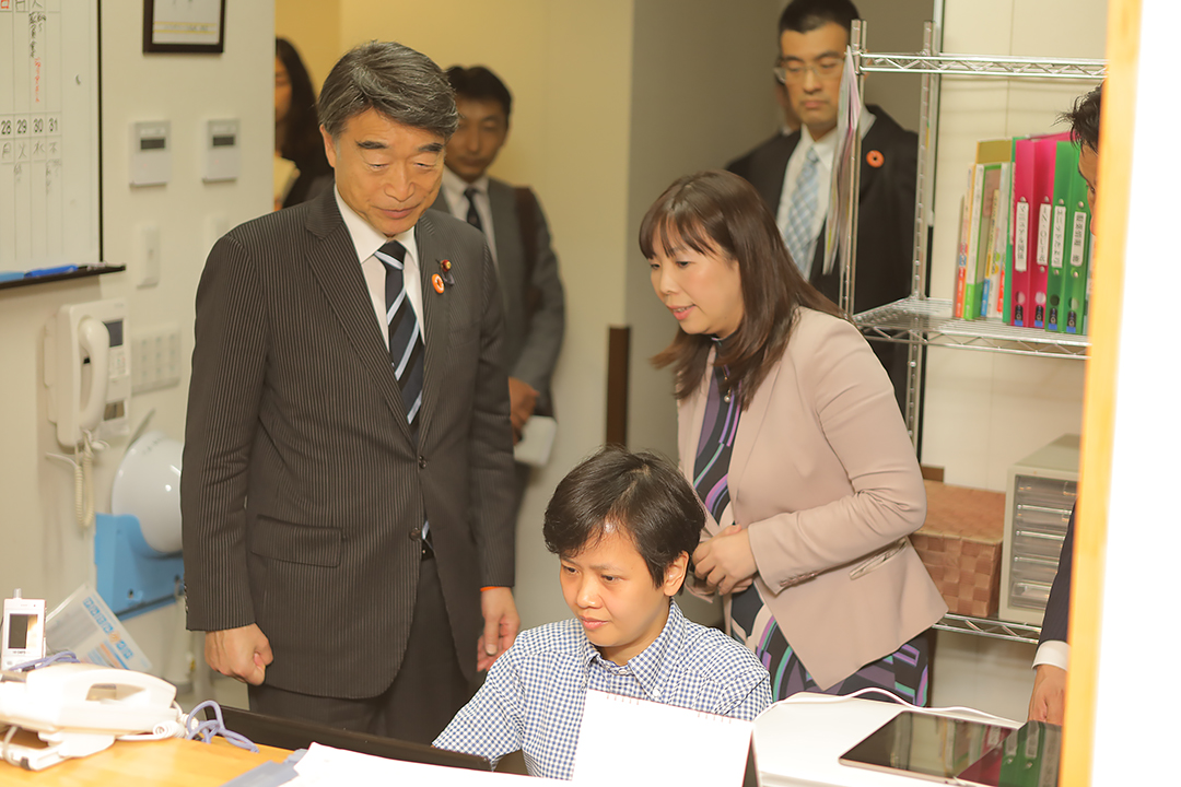 視察を終えて大臣からは、「今回の視察で私が特に注目したのは、介護人材の処遇の問題です。この施設では日本人と同等以上の待遇を用意してくださっている。そして、人材育成のステップアップの仕組みも導入されており、管理職への登用という道も開かれている。きちんとしたマネジメントのもと、外国人材受け入れのモデル的な取り組みをしてくださっている施設だと思います。受け入れ問題では、いろいろと国会でも議論がありましたが、こうした優良な取り組み事例をしっかり横展開していくことが大切です。すばらしい施設を見せていただき、非常に参考になりました。ありがとうございました」とコメントいただきました。