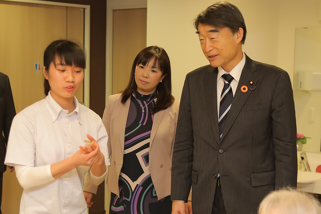 冒頭、大臣より、「国内の介護現場で就労される外国の方々は、年々増加しており、今年4月からは新たな介護人材の受け入れを開始する予定です。厚労省では、こうした方々が円滑に就労できるようにしっかり取り組んでまいりたいと思います。本日はEPA介護福祉士・候補者が就労されている現場を見せていただき、また、課題があればお聞きし、実際の施策に反映出来ればと思いますので、どうぞよろしくお願いします」とご挨拶をいただきました。