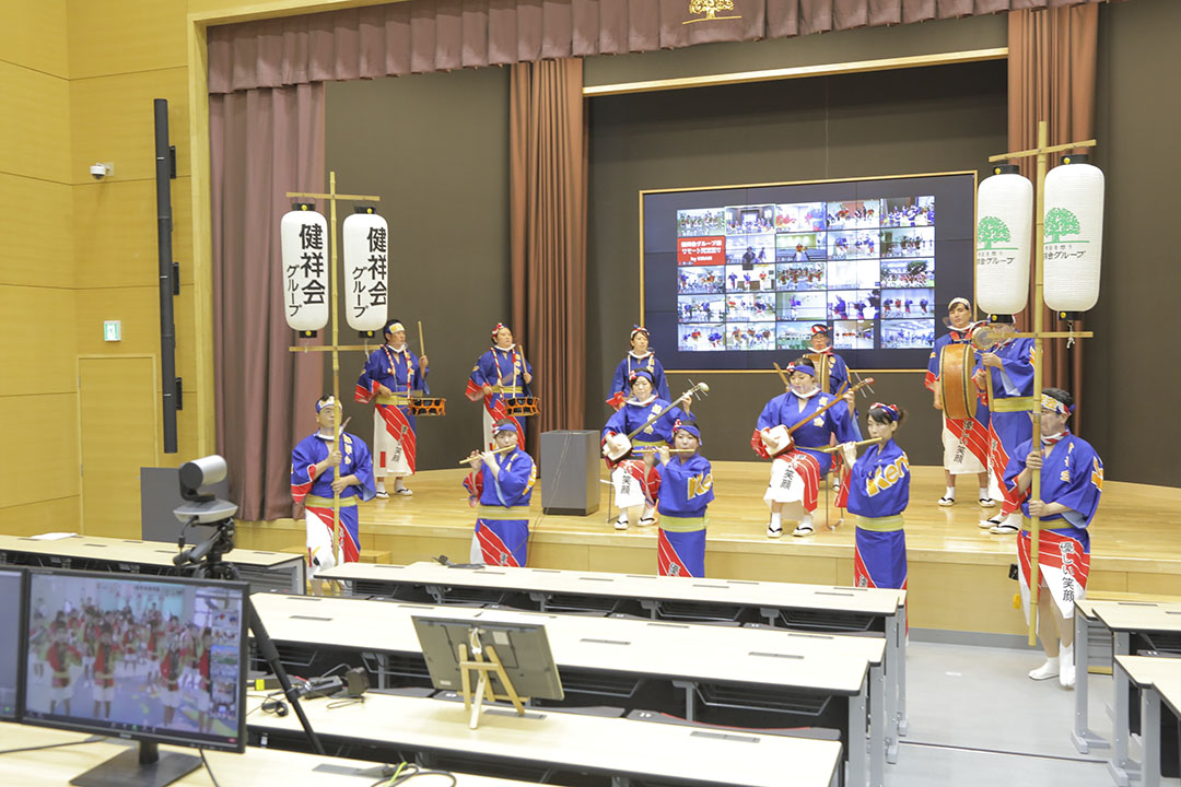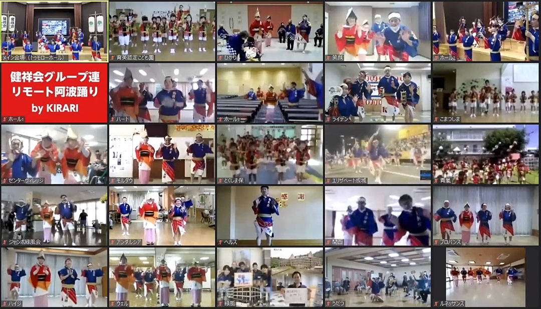 徳島市国府町の健祥会トゥモローホールと20施設をweb会議ツールで繋ぎ、ホールでは健祥会グループ連の職員たちがぞめきのリズムを奏でます。それにあわせて施設では、利用者様、園児、そして職員、総勢210名が踊りました。初めて利用者様も参加し、一緒に踊ることができたのは、リモートだからこそ。踊る阿呆の威勢のいい様子を、香川、高知、大阪、京都、東京まで、グループ全66施設に配信。コロナを乗り越え、どうか来年は開催できますようにとの願いを込めて、笑顔とともに踊り子のメッセージも届けました。