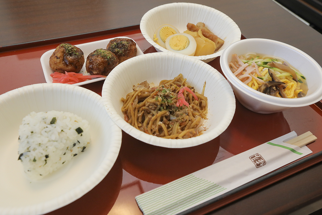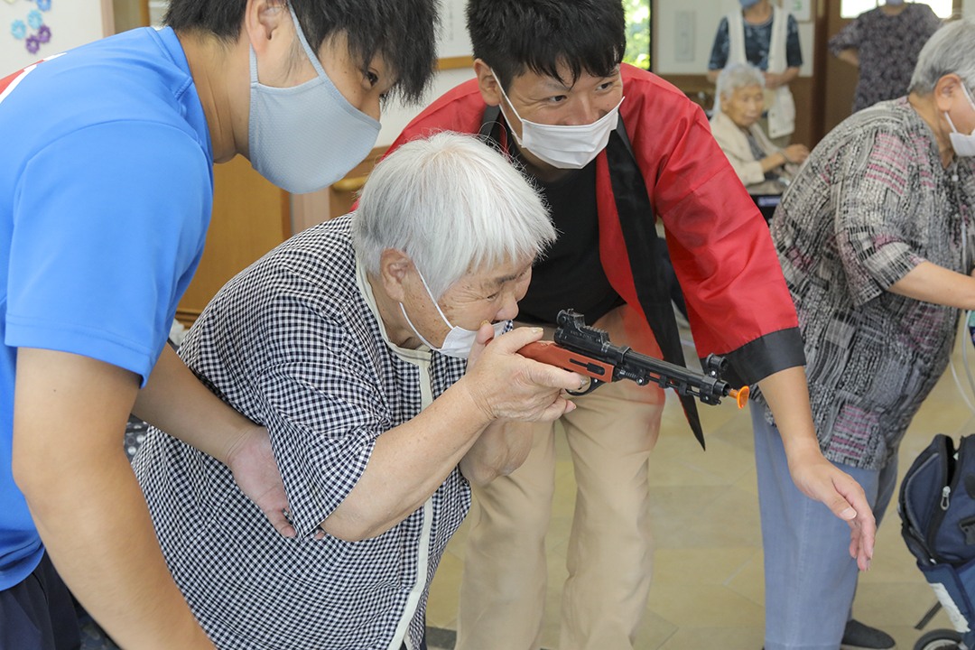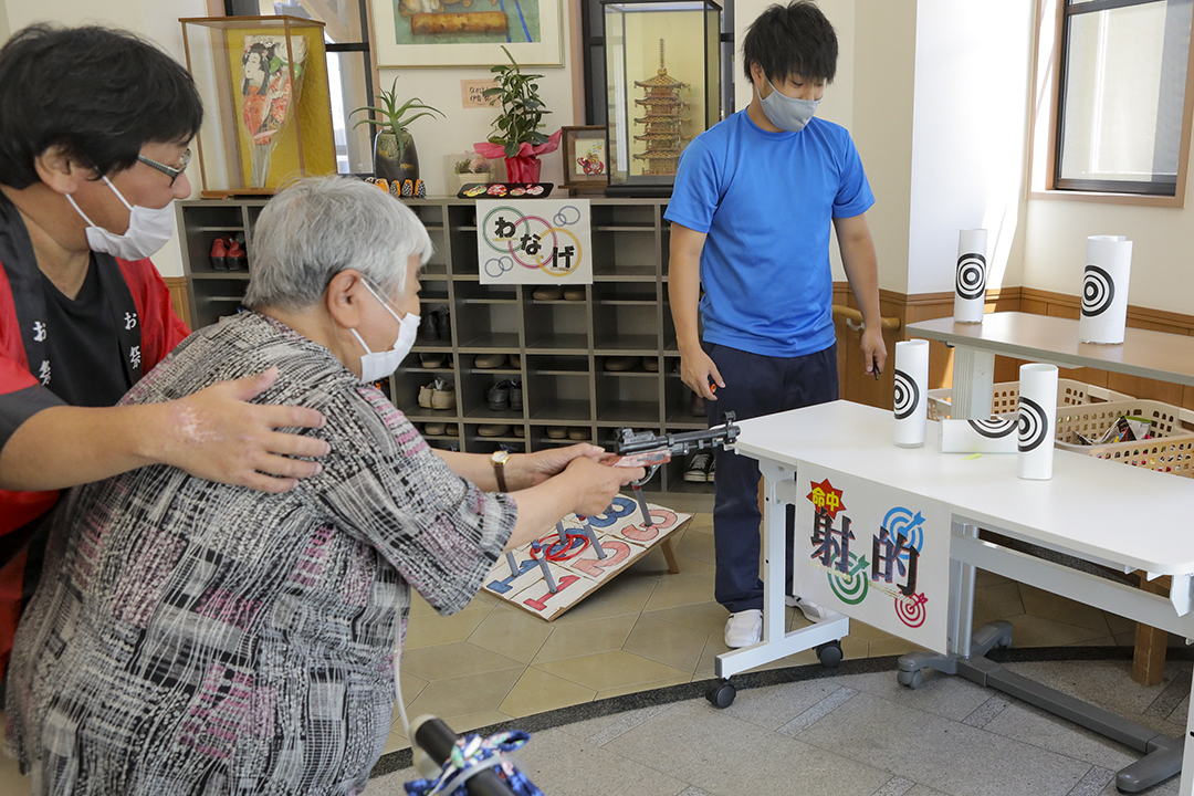ゲームコーナーでは多くの皆さんが張り切って輪投げや射的にチャレンジ。昼食は、たこ焼きや焼きそば、おでんなど、屋台メニューでお祭り気分を盛り上げます。グループホームのふたつのユニットとデイセンター、3つの場で、それぞれに時間を分けて、密にならずにゆったりと楽しんでいただきました。