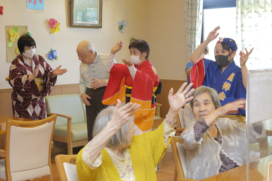 フィナーレは職員による各コーナーへの踊り込み。はじめは手拍子で見ていた利用者様も、掛け声をくださったり、手振りをなさったり、お元気な方は立ち上がって一緒に踊られたり、一足早い阿波踊りを楽しんでくださいました。