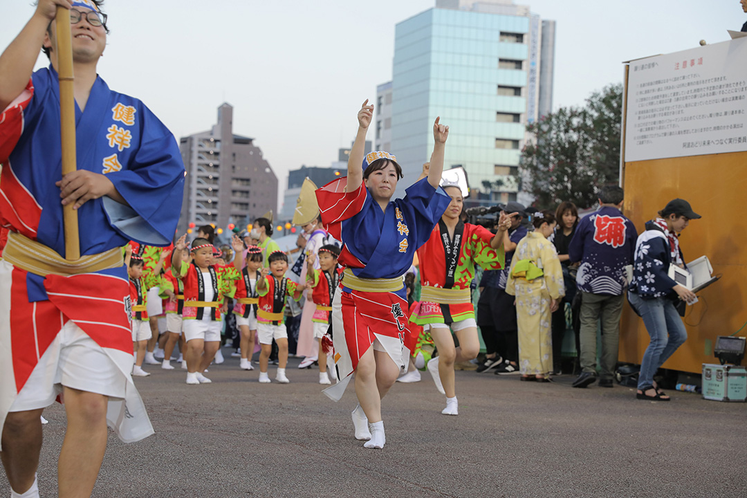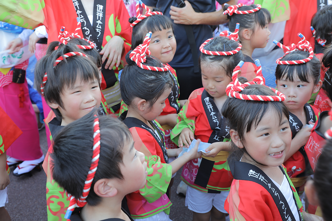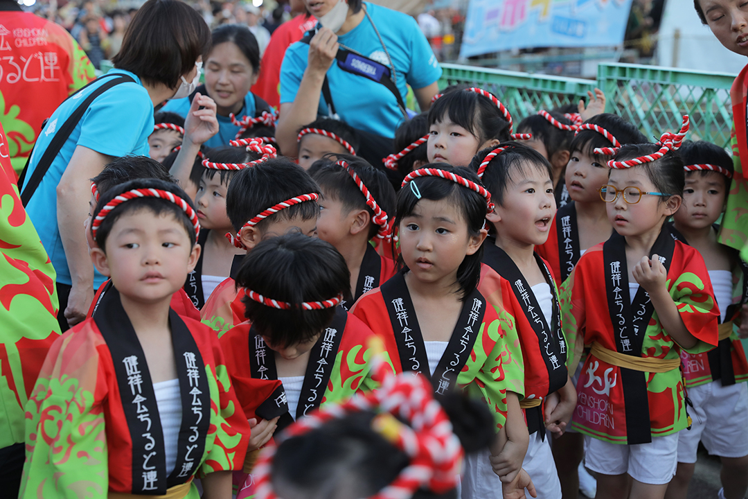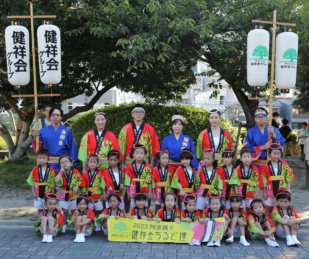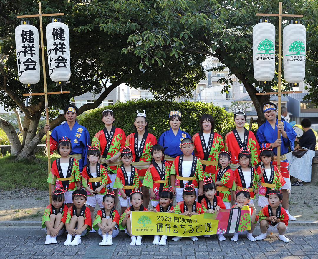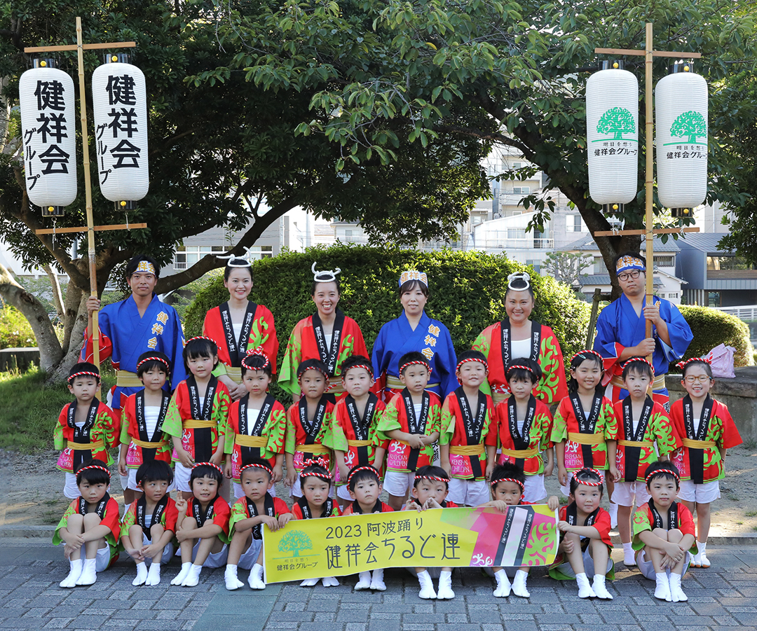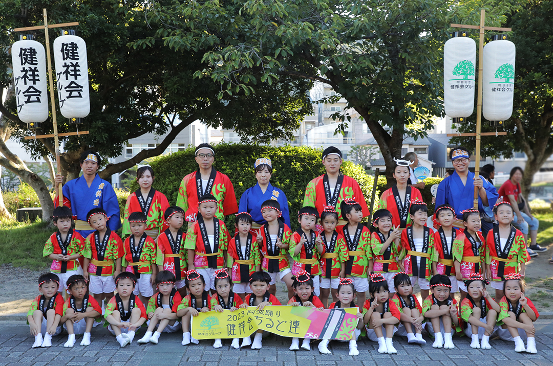 初日の12日、健祥会グループからは、育英認定こども園、青嵐認定こども園、とくしま健祥会認定こども園、こまつしま健祥会認定こども園、4園の園児たちが、元気いっぱい踊りに沸き立つ徳島の街へ。常務理事中村晃子を連長に、園児90名、認定こども園職員からなる「健祥会ちるど連」です。