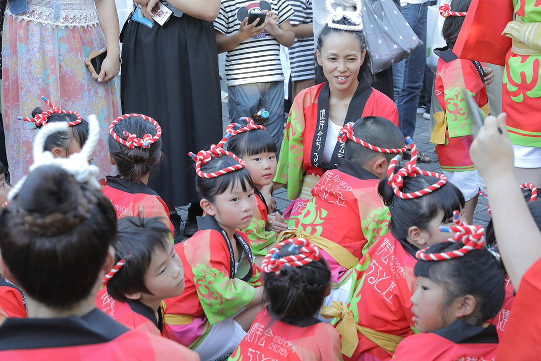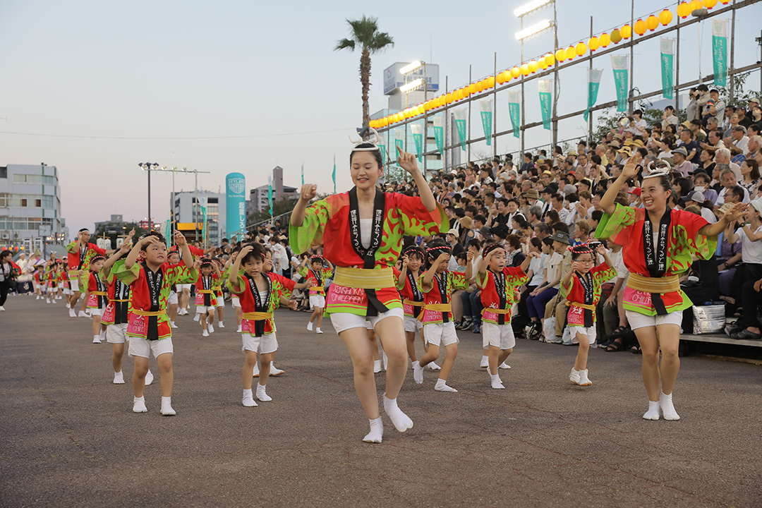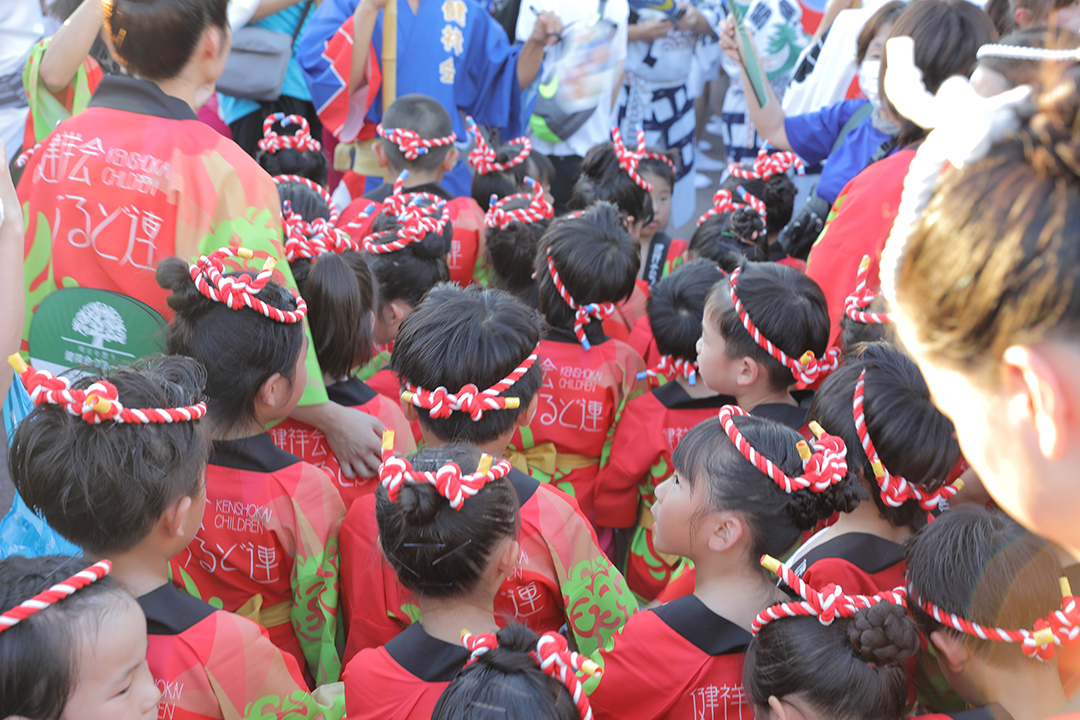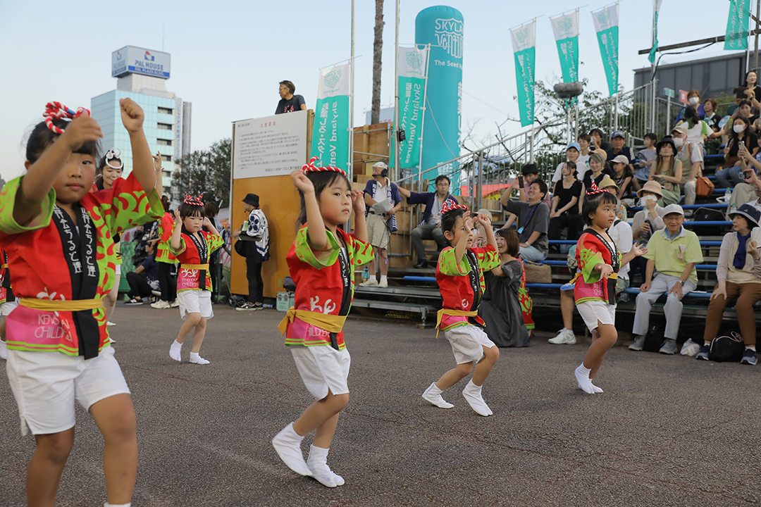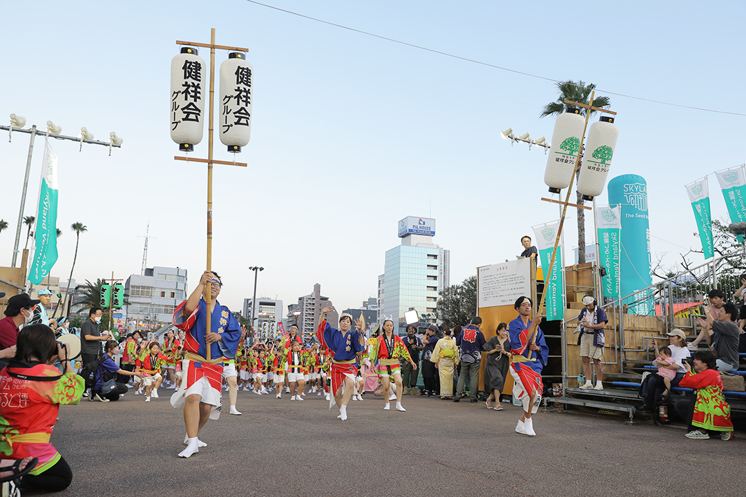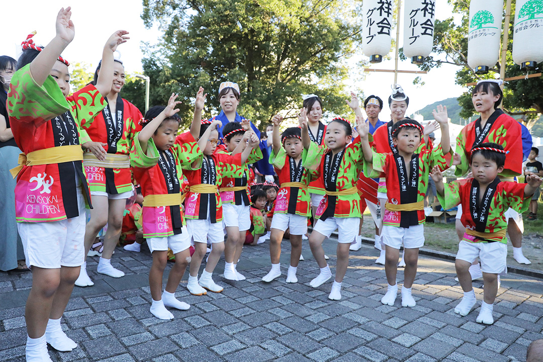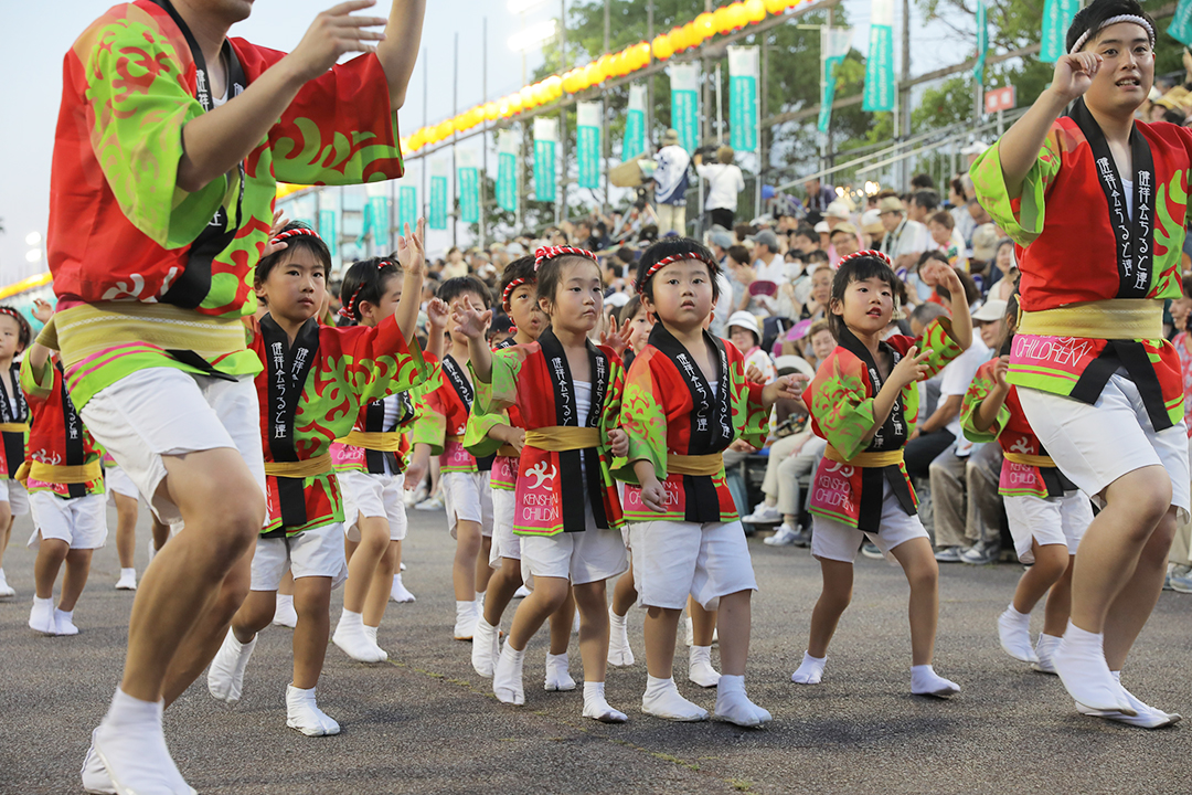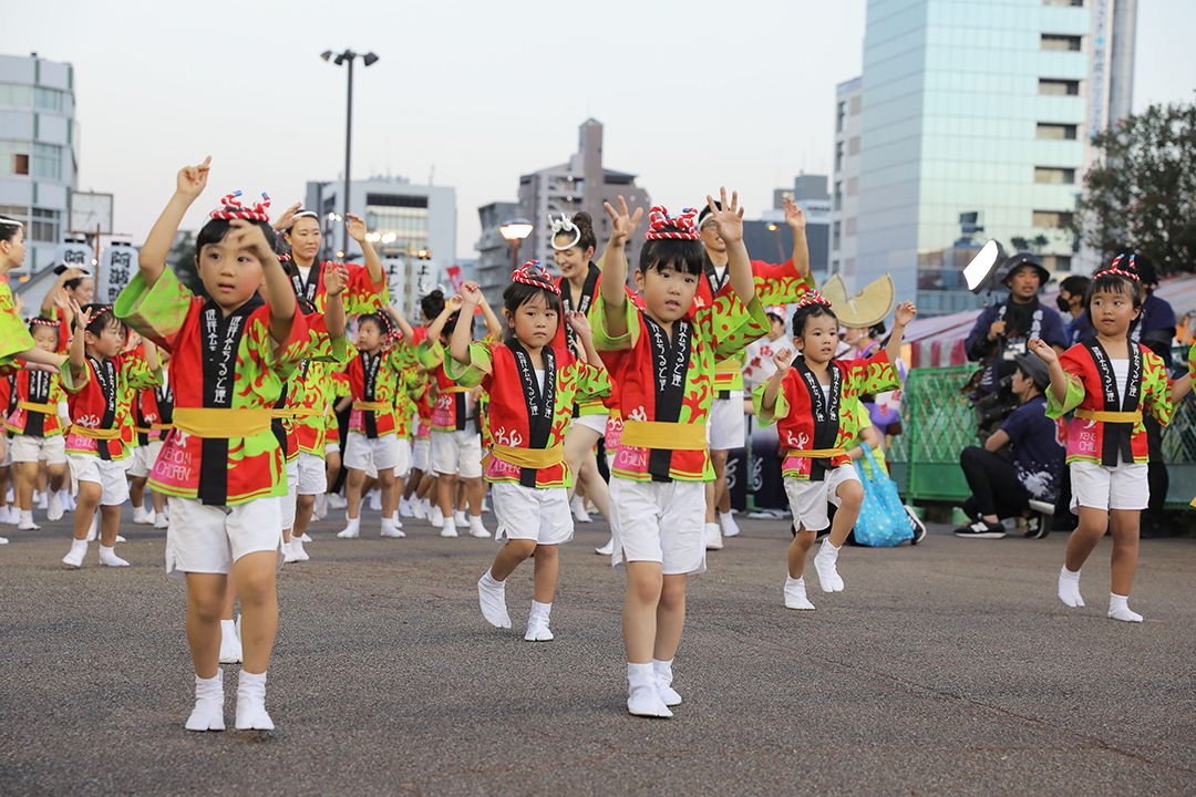 初日の12日、健祥会グループからは、育英認定こども園、青嵐認定こども園、とくしま健祥会認定こども園、こまつしま健祥会認定こども園、4園の園児たちが、元気いっぱい踊りに沸き立つ徳島の街へ。常務理事中村晃子を連長に、園児90名、認定こども園職員からなる「健祥会ちるど連」です。
