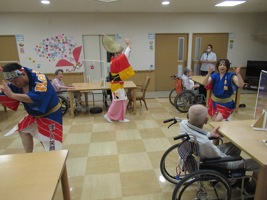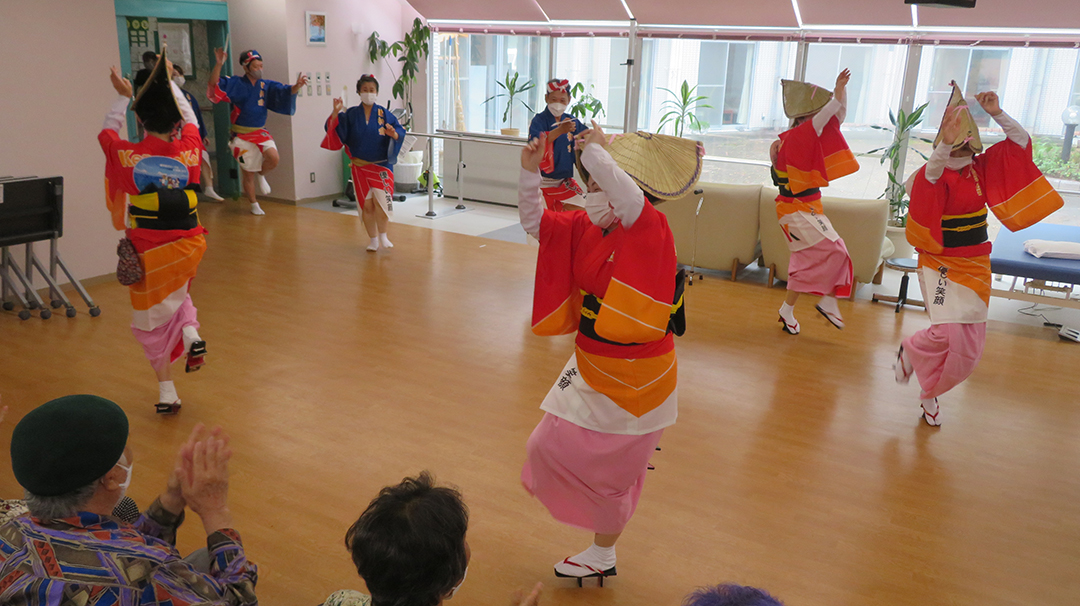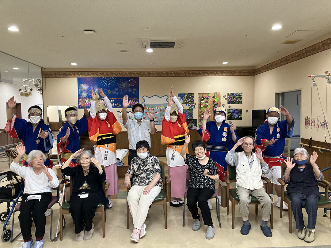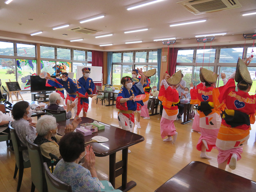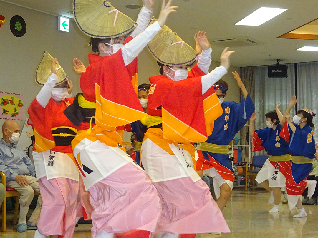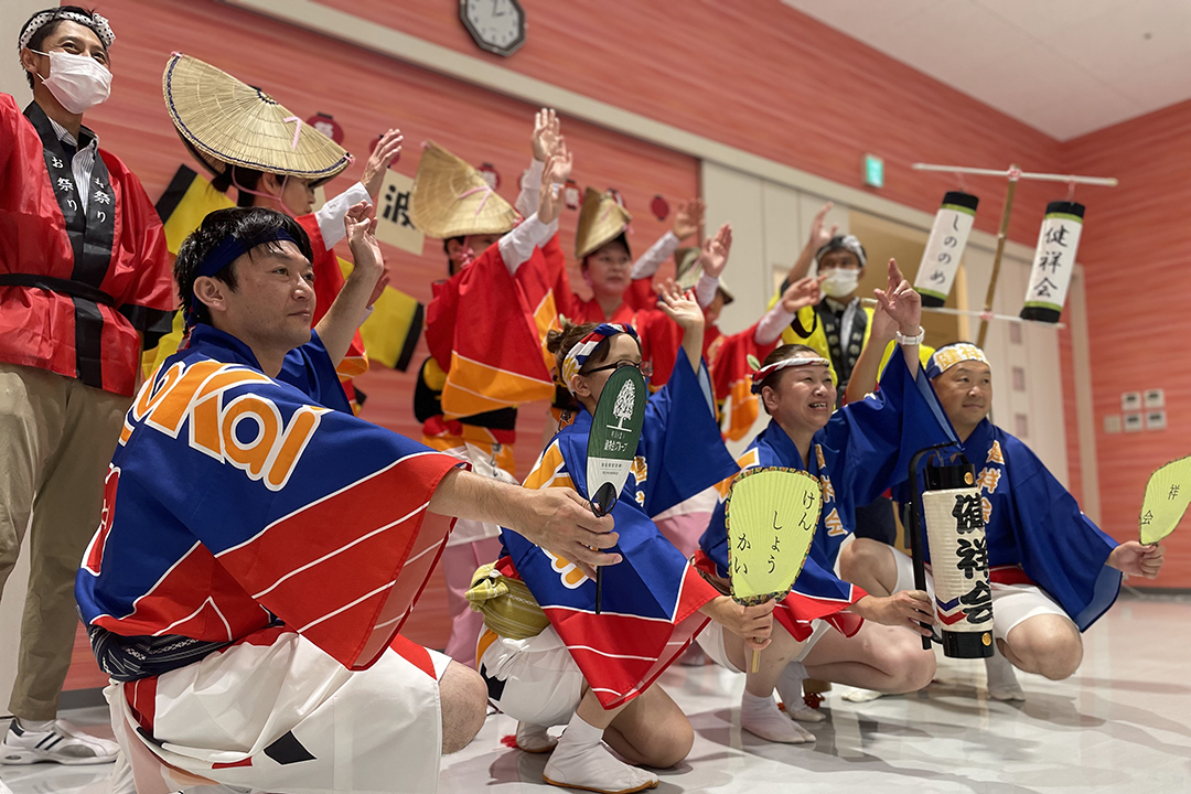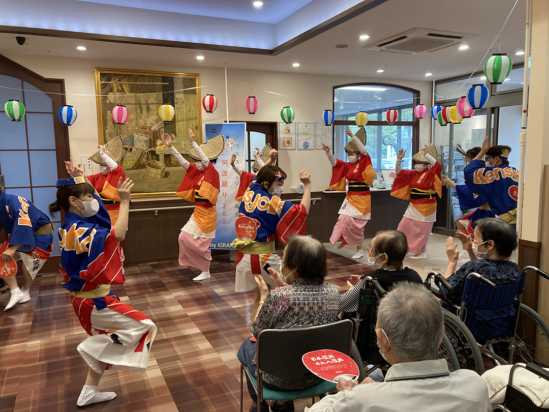 また、施設では、KIRARI WOMANネットワークの活動として、「出張!健祥会グループ連 阿波踊り2023 by KIRARI」を開催。地域ごとに職員有志で結成したミニグループ連が各施設へ踊り込み、利用者様にお盆の賑わいを届けました。