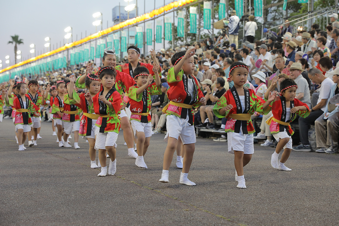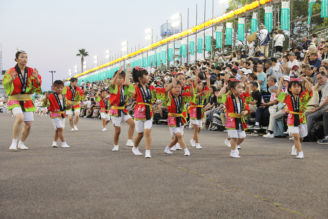 4年ぶりの桟敷とあって小さな踊り子たちは大張り切り。「明日を想う」の高張り提灯のもと、阿波鳴連の皆様にサポートいただきながら藍場浜演舞場で元気な踊りを披露しました。