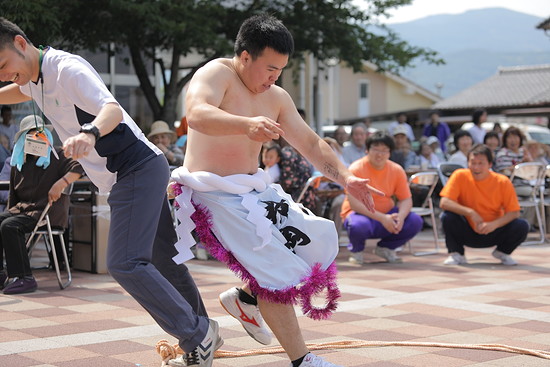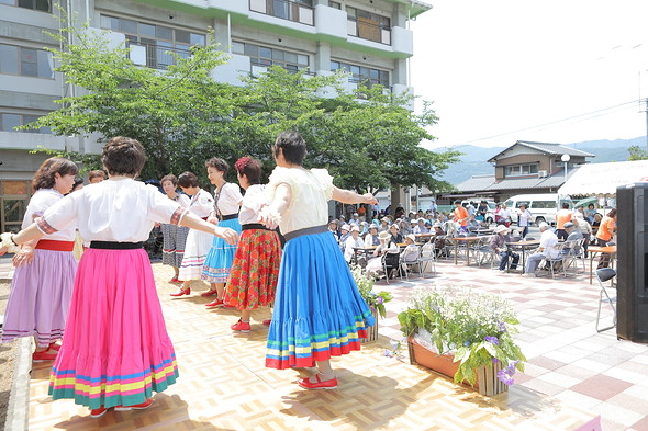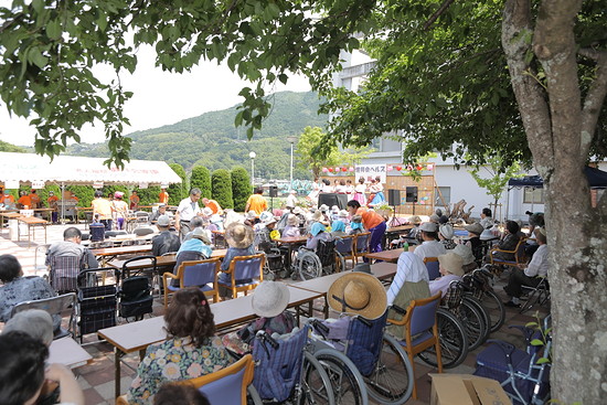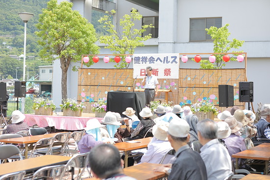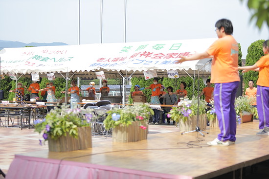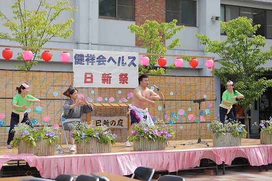 優雅にフラダンスを踊ってくださったのは三島婦人会の皆様。カラオケ大会のゲストにはNHKのど自慢大会優勝という地域の方を迎え、プロ顔負けのすばらしい歌声を披露していただきました。また、徳島健祥会福祉専門学校からヘルスに実習に来ている学生たち企画の尻相撲大会&相撲体操では会場が笑いの渦に。最後にPT・OTによる元気体操で「元気で長生き」への思いを参加者みんなが新たにしました。焼きそばやお団子、アイスクリームなどの模擬店も並び、笑顔が「日新の庭」にあふれた1日でした。地域の皆様のご協力に心より感謝申し上げます。