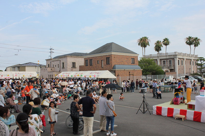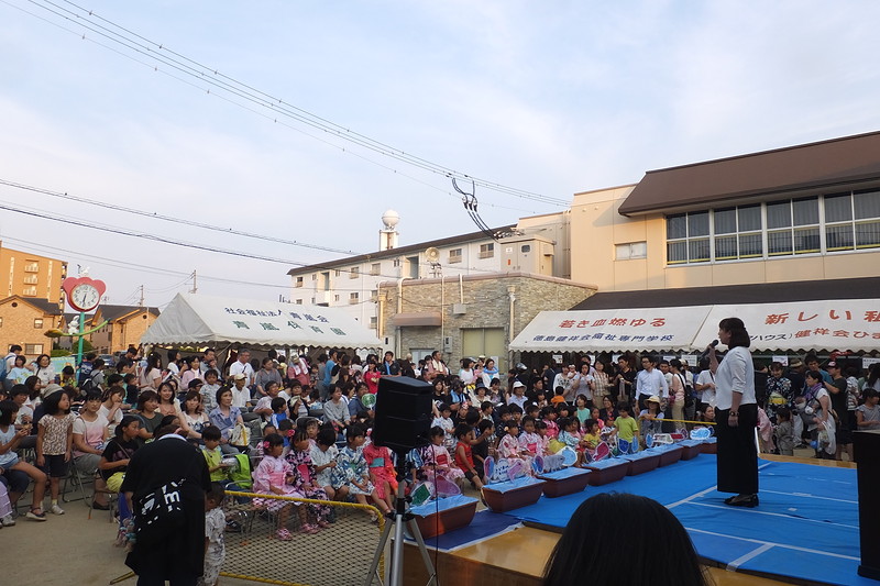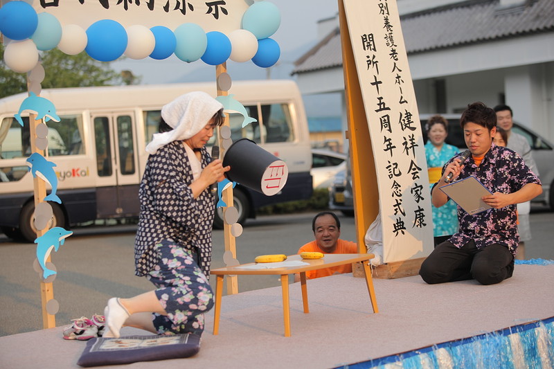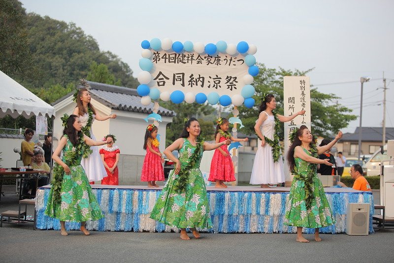 7月15日、特別養護老人ホーム健祥会家康 ケアハウス健祥会うだつで、健祥会グループの各施設のトップを切って、地域の皆様とともに楽しむ恒例の納涼祭が開催されました。健祥会家康の15周年記念式典終了後のステージで、地域の有志の方のフラダンス、三島小学校の皆さんの太鼓演奏、職員の演芸などが披露されました。模擬店には定番のお祭りメニューが並び、笑顔と会話の渦巻く中、夏の宵が賑やかに暮れてゆきました。利用者様もご家族とのひとときを楽しんでくださったようです。
