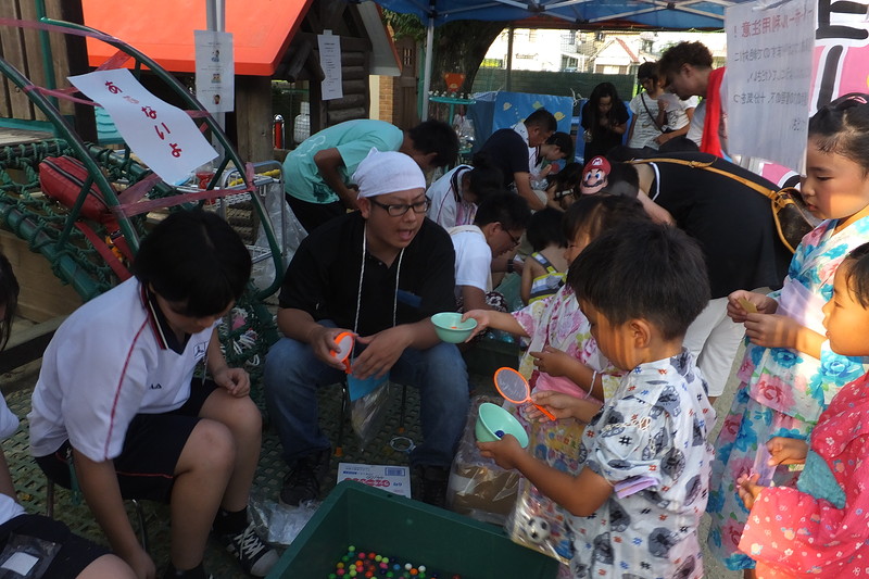 同じ日、青嵐認定こども園(徳島市北田宮)で、翌16日には育英認定こども園(徳島市中昭和町)で、夏まつりが開催されました。両園は、認定こども園となって初の夏まつりです。保護者の皆様のご協力のもと、お店やさん、あそびコーナー、食べ物やさんが店開きし、日々の教育的取り組みの一端をご紹介するコーナーや体験コーナーも人気!地元の中学校、高校の生徒さんや大学の学生さん、そして徳島健祥会福祉専門学校の学生など、多くのボランティアの方々にお手伝いいただきました。地域の三世代の皆様が大勢お越しくださり、暑さも吹っ飛ばす、楽しいお祭りになりました。