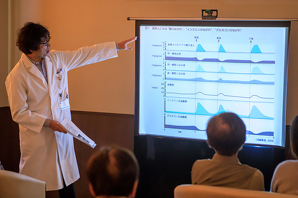三浦副院長は、糖尿病のメカニズムと、食事とからだの機能やホルモン分泌との関係を解説。時間栄養学の観点から、いかに規則正しい生活と食習慣、そして運動が大切であるかをお話しました。