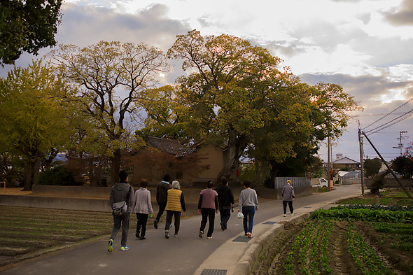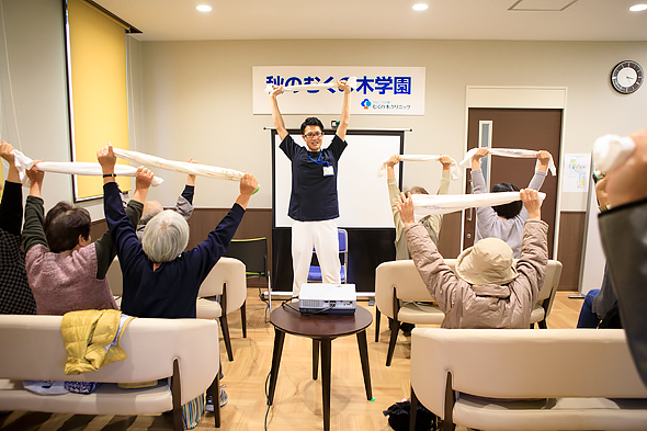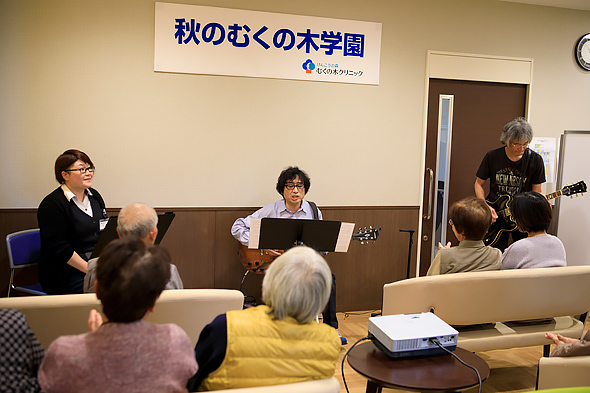 レクチャーのあとは、音楽好きの副院長と事務職員らによる即席バンド「センチメンタルむくの木ハウス」が軽音楽の演奏をプレゼント。心をにっこりリラックスさせた後、理学療法士とともに体操でからだもリラックスさせました。最後のメニューは散歩。2Kmの道のりを30分ほどかけて歩き、程よい運動ができました。